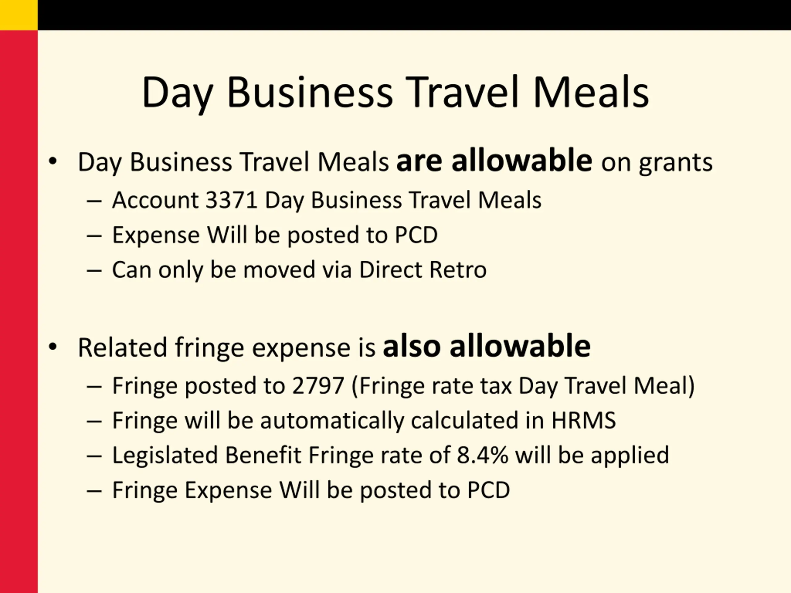 Day Business Travel Meals Day Business Travel Meals are allowable on grants Account 3371 Day Business Travel Meals Expense Will be posted to PCD Can only be moved via Direct Retro Related fringe expense is also allowable Fringe posted to 2797 (Fringe rate tax Day Travel Meal) Fringe will be automatically calculated in HRMS Legislated Benefit Fringe rate of 8.4% will be applied Fringe Expense Will be posted to PCD