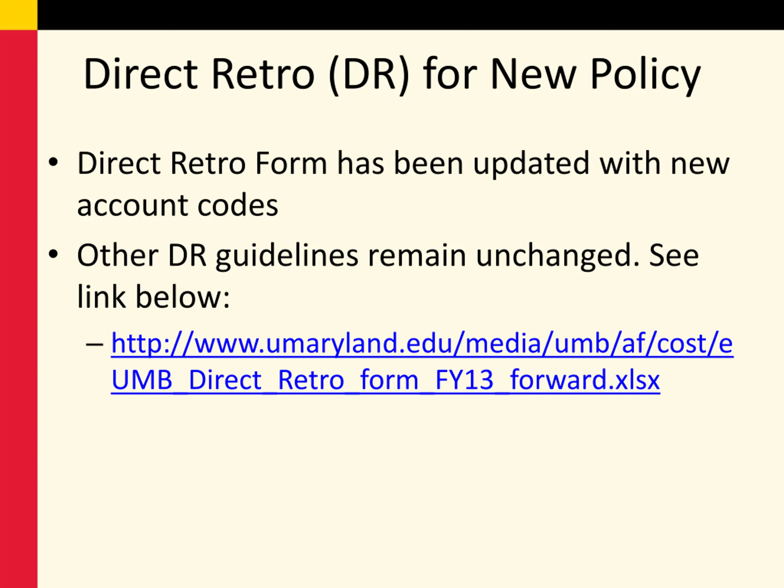 Direct Retro (DR) for New Policy Direct Retro Form has been updated with new account codes Other DR guidelines remain unchanged. See link below: http://www.umaryland.edu/media/umb/af/cost/e UMB_Direct_Retro_form_FY13_forward.xlsx