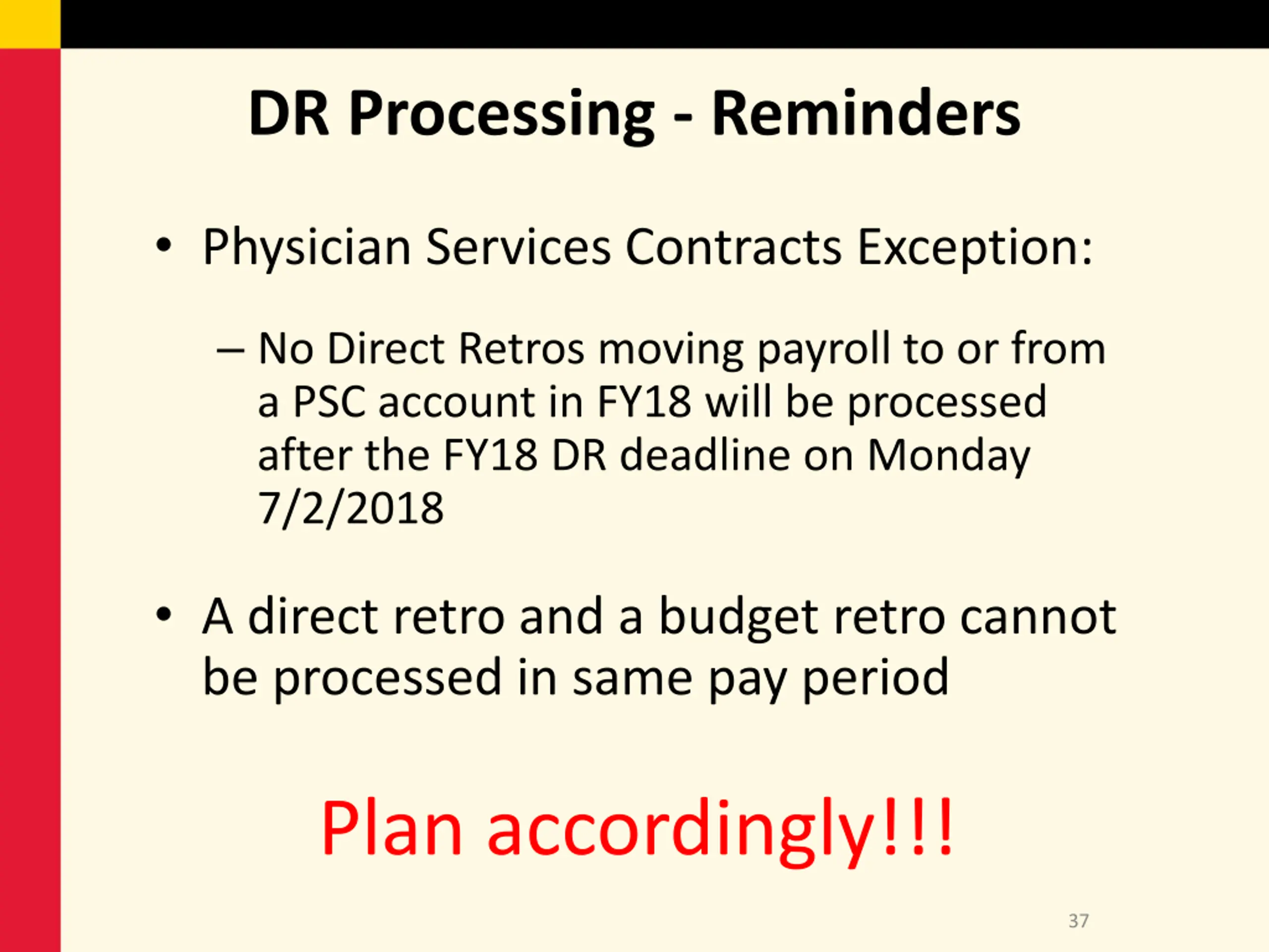 DR Processing - Reminders Physician Services Contracts Exception: No Direct Retros moving payroll to or from a PSC account in FY18 will be processed after the FY18 DR deadline on Monday 7/2/2018 A direct retro and a budget retro cannot be processed in same pay period Plan accordingly!!! 37
