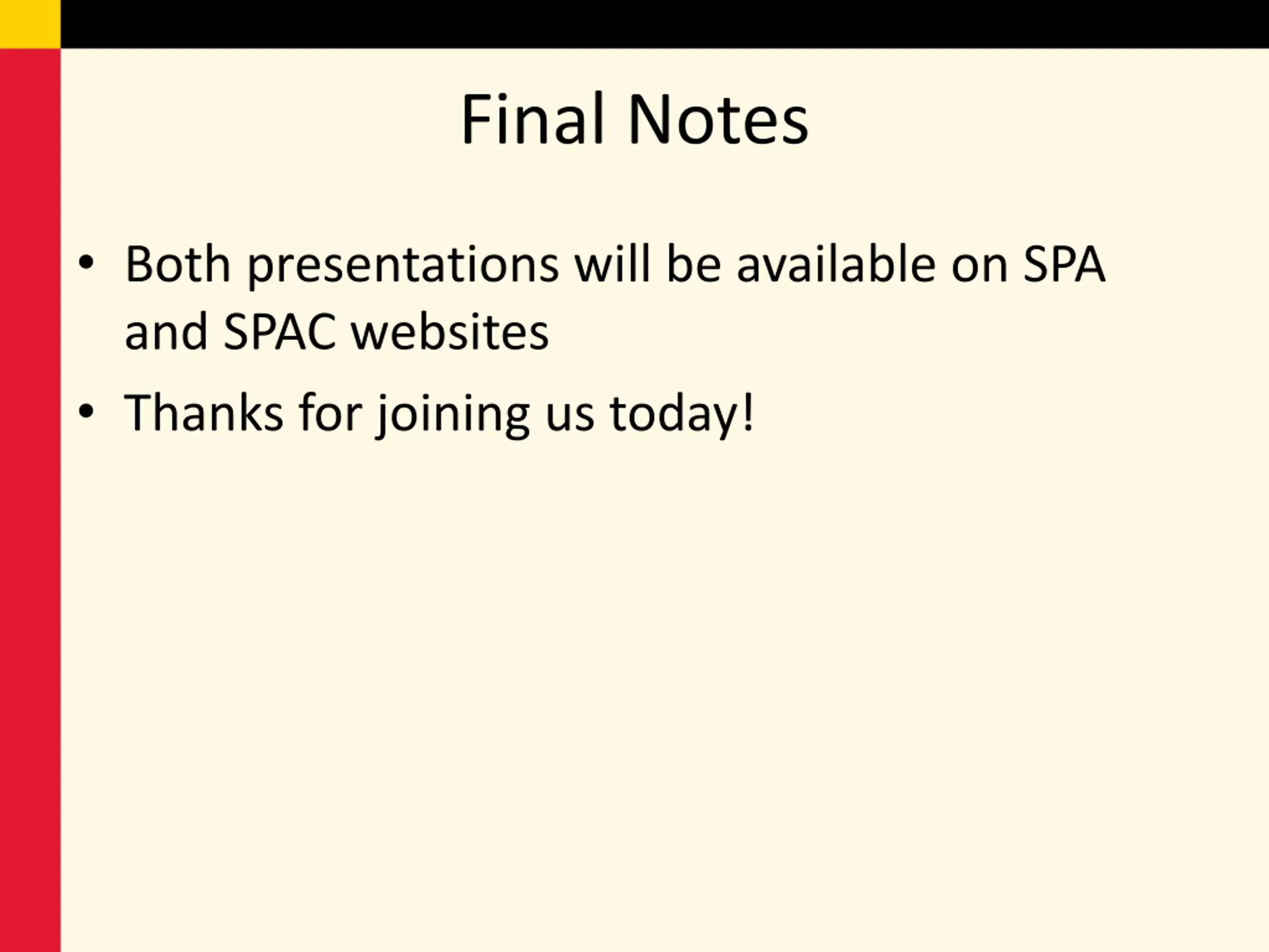 Final Notes Both presentations will be available on SPA and SPAC websites Thanks for joining us today!