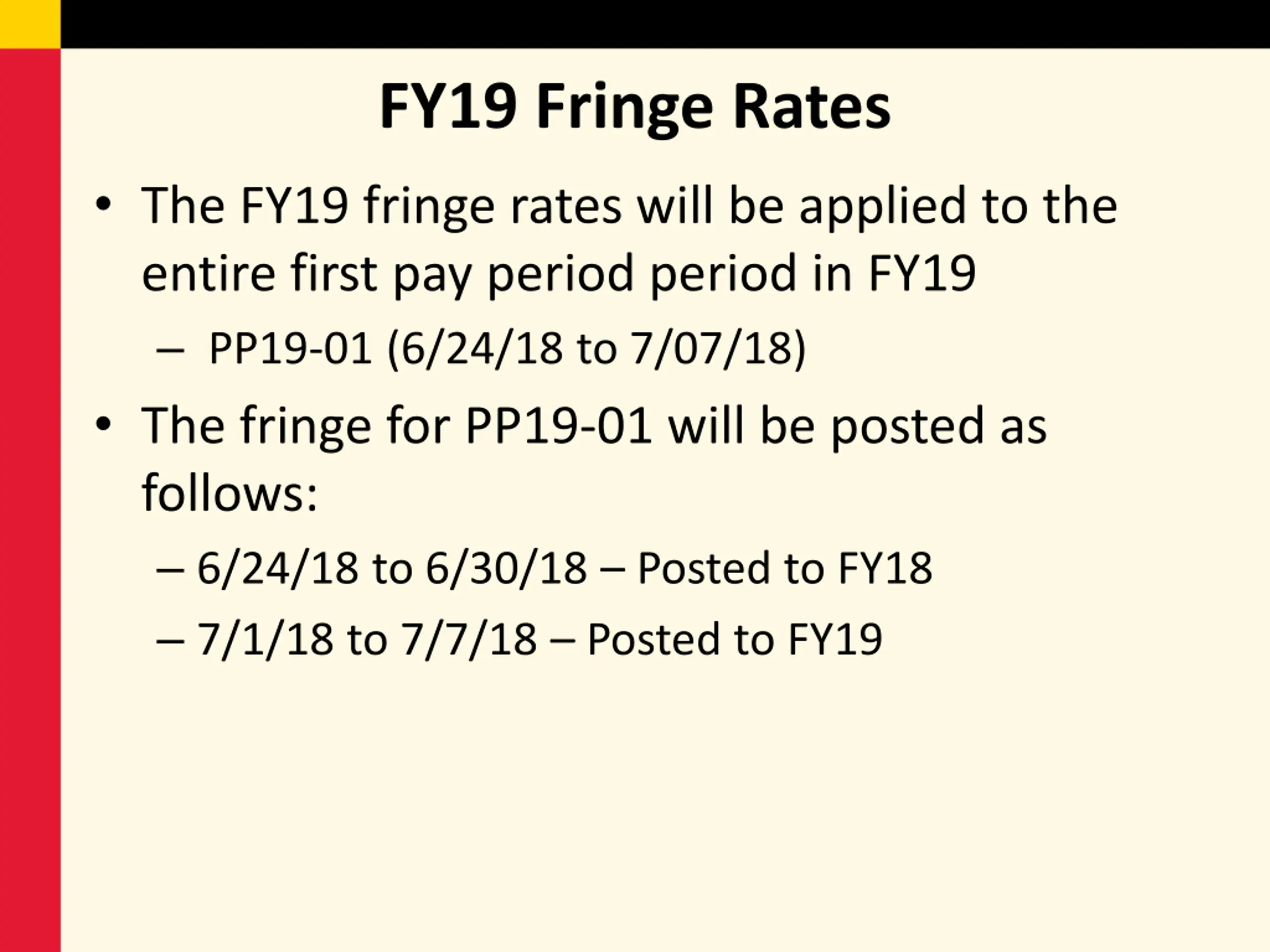 FY19 Fringe Rates The FY19 fringe rates will be applied to the entire first pay period period in FY19 PP19-01 (6/24/18 to 7/07/18) The fringe for PP19-01 will be posted as follows: 6/24/18 to 6/30/18 Posted to FY18 7/1/18 to 7/7/18 Posted to FY19