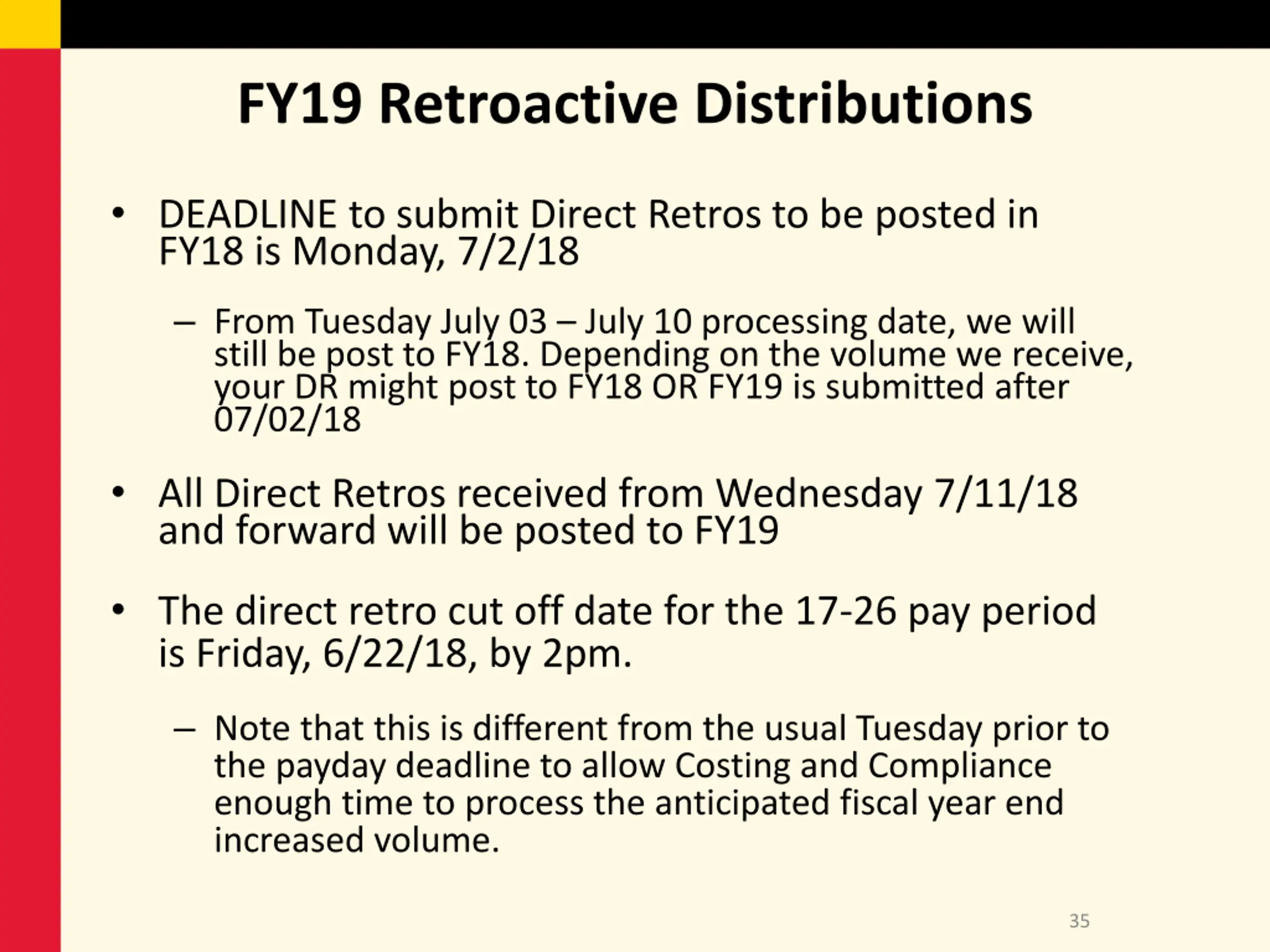 FY19 Retroactive Distributions DEADLINE to submit Direct Retros to be posted in FY18 is Monday, 7/2/18 From Tuesday July 03 July 10 processing date, we will still be post to FY18. Depending on the volume we receive, your DR might post to FY18 OR FY19 is submitted after 07/02/18 All Direct Retros received from Wednesday 7/11/18 and forward will be posted to FY19 The direct retro cut off date for the 17-26 pay period is Friday, 6/22/18, by 2pm. Note that this is different from the usual Tuesday prior to the payday deadline to allow Costing and Compliance enough time to process the anticipated fiscal year end increased volume. 35