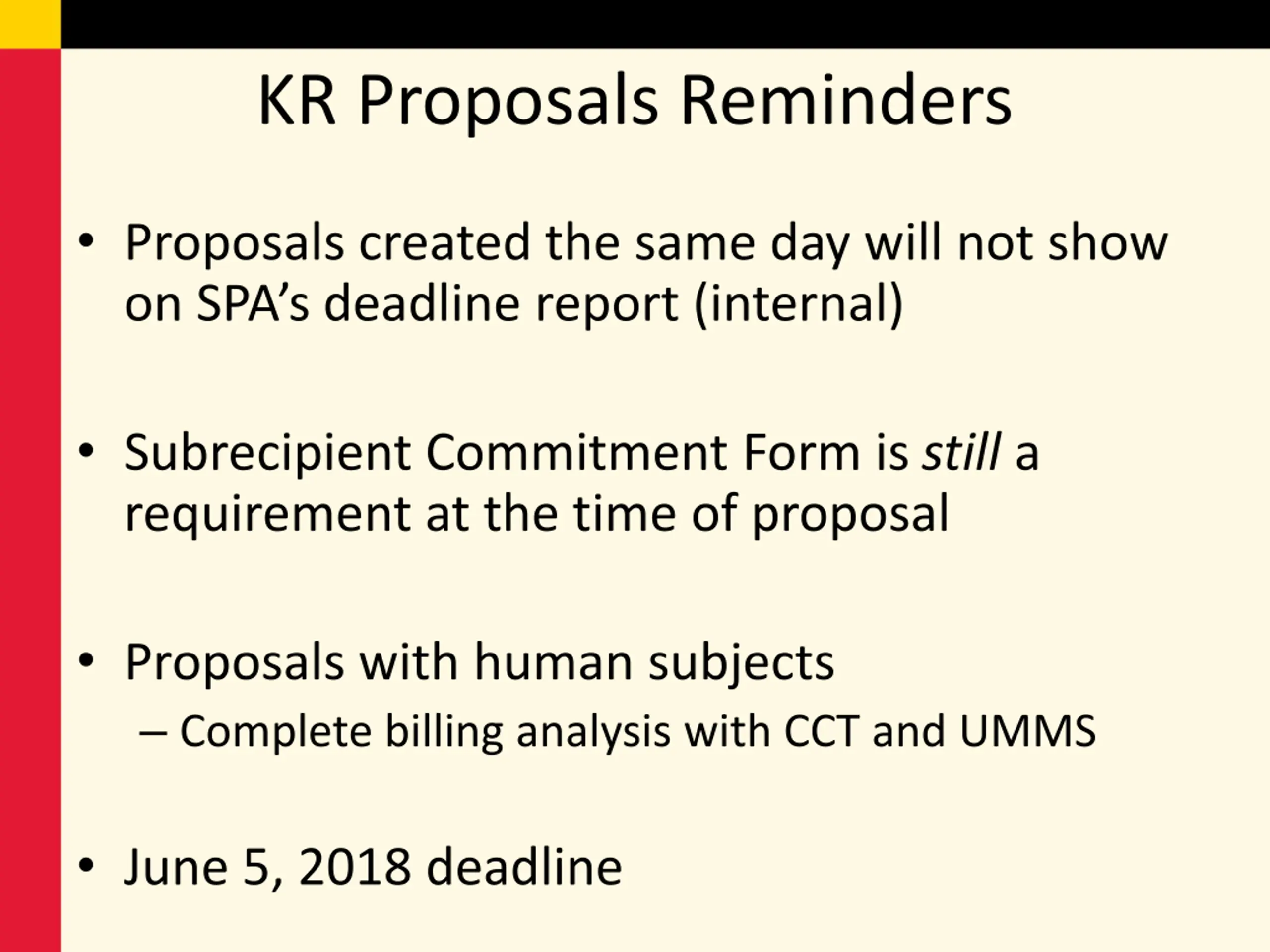 KR Proposals Reminders Proposals created the same day will not show on SPA s deadline report (internal) Subrecipient Commitment Form is still a requirement at the time of proposal Proposals with human subjects Complete billing analysis with CCT and UMMS June 5, 2018 deadline