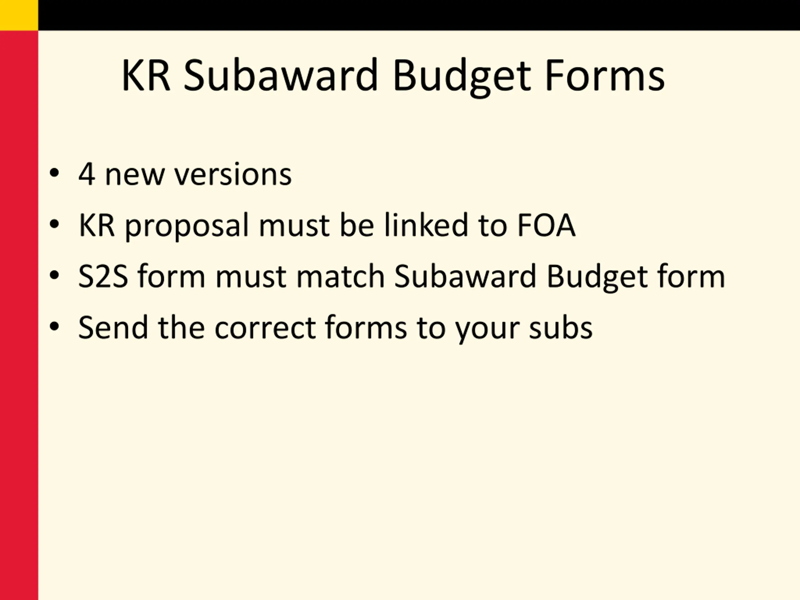 KR Subaward Budget Forms 4 new versions KR proposal must be linked to FOA S2S form must match Subaward Budget form Send the correct forms to your subs