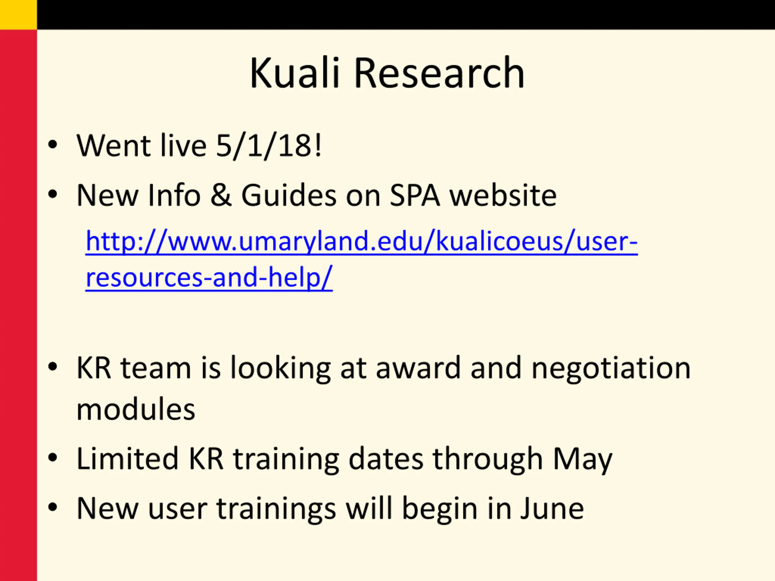 Kuali Research Went live 5/1/18! New Info & Guides on SPA website http://www.umaryland.edu/kualicoeus/user- resources-and-help/ KR team is looking at award and negotiation modules Limited KR training dates through May New user trainings will begin in June