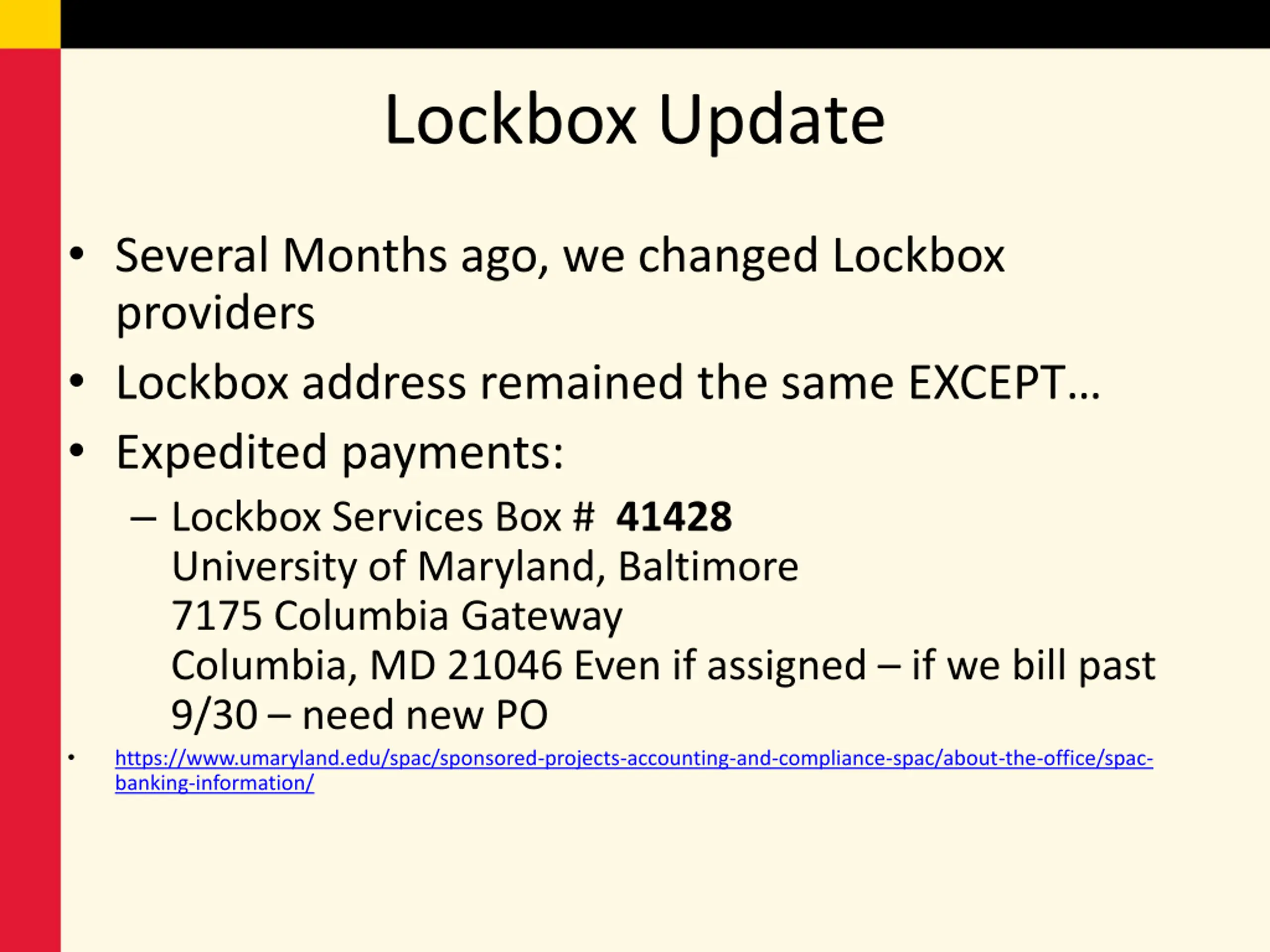 Lockbox Update Several Months ago, we changed Lockbox providers Lockbox address remained the same EXCEPT Expedited payments: Lockbox Services Box # 41428 University of Maryland, Baltimore 7175 Columbia Gateway Columbia, MD 21046 Even if assigned if we bill past 9/30 need new PO https://www.umaryland.edu/spac/sponsored-projects-accounting-and-compliance-spac/about-the-office/spac- banking-information/
