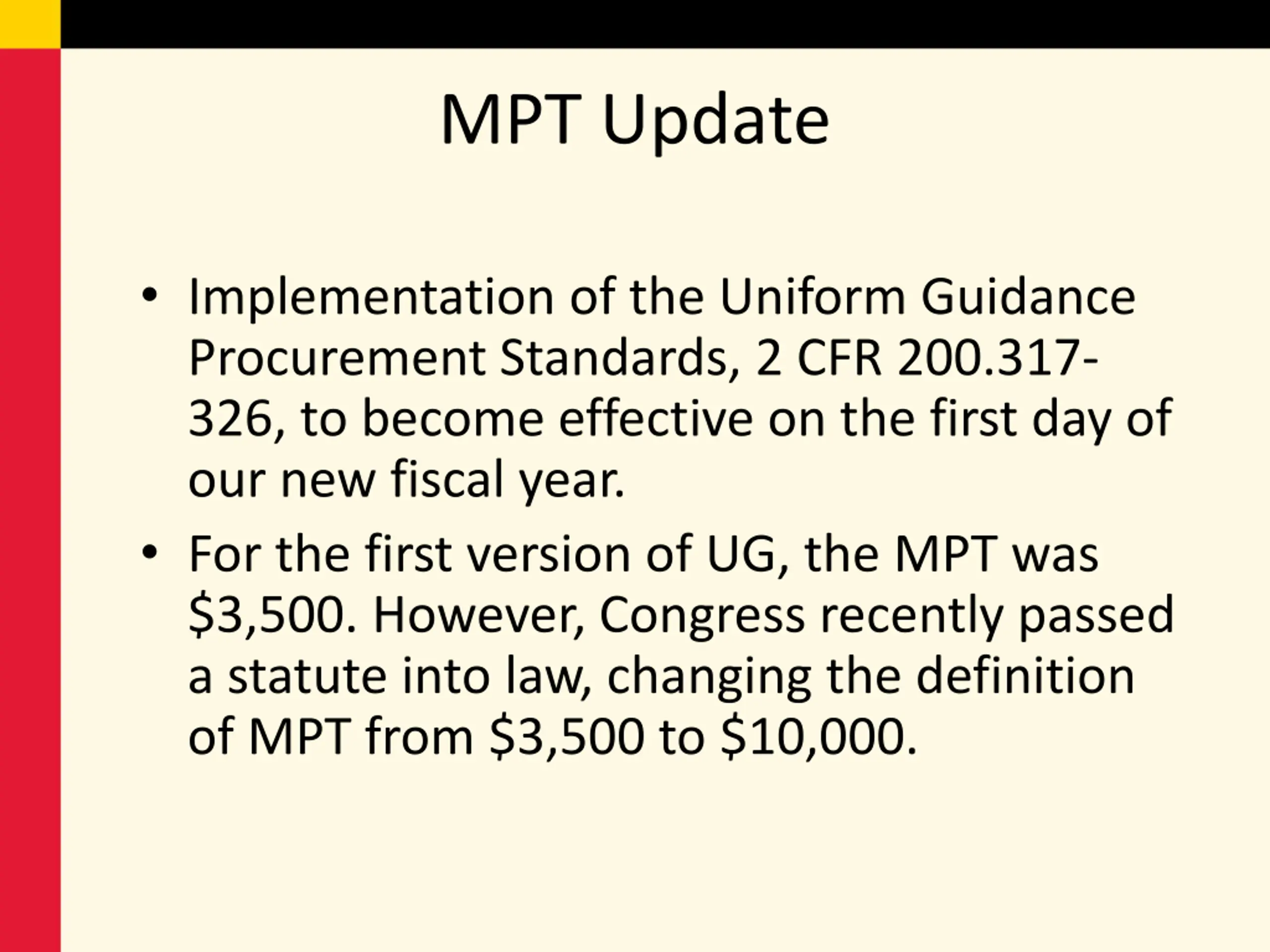 MPT Update Implementation of the Uniform Guidance Procurement Standards, 2 CFR 200.317- 326, to become effective on the first day of our new fiscal year. For the first version of UG, the MPT was $3,500. However, Congress recently passed a statute into law, changing the definition of MPT from $3,500 to $10,000.
