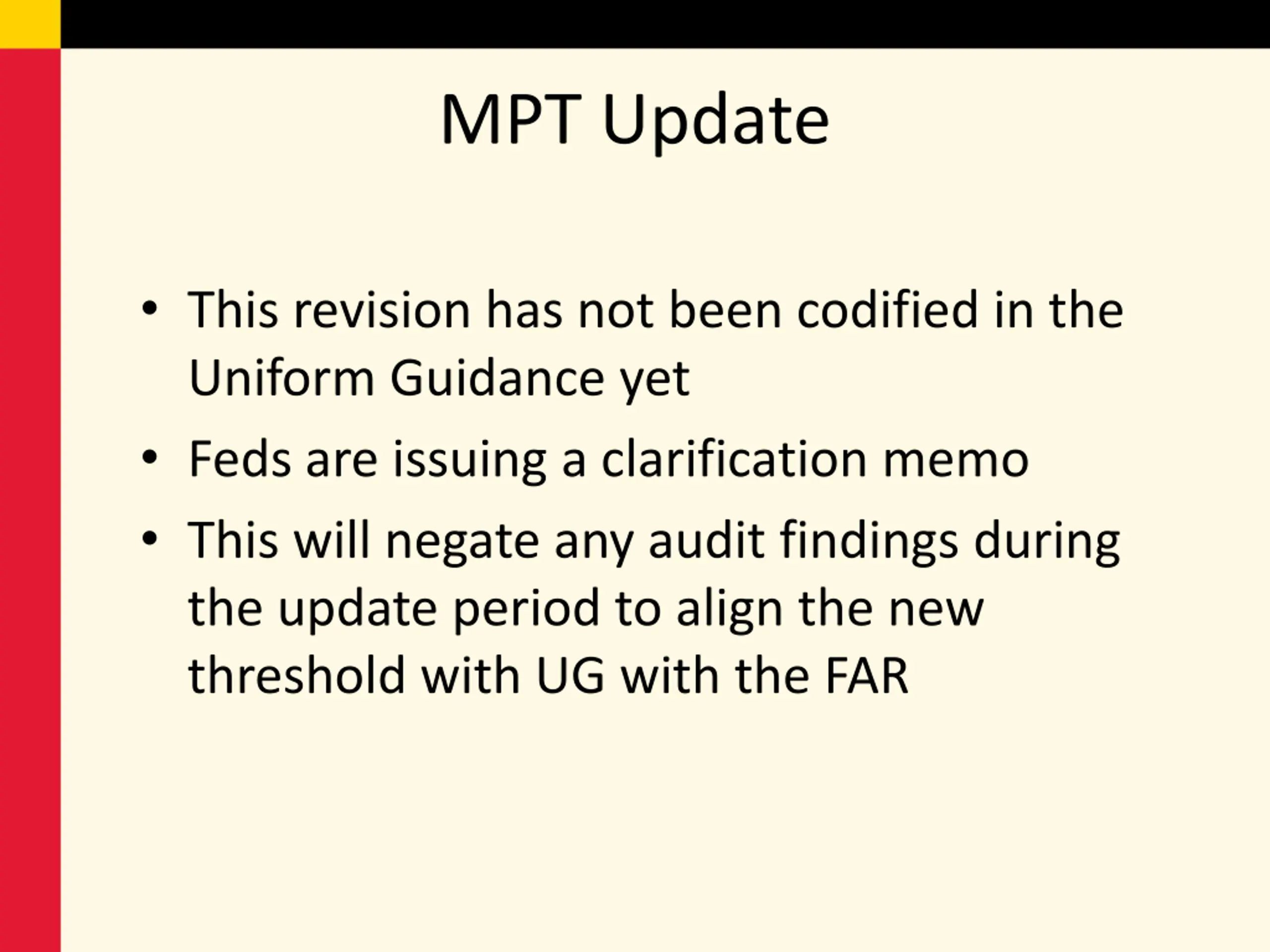 MPT Update This revision has not been codified in the Uniform Guidance yet Feds are issuing a clarification memo This will negate any audit findings during the update period to align the new threshold with UG with the FAR