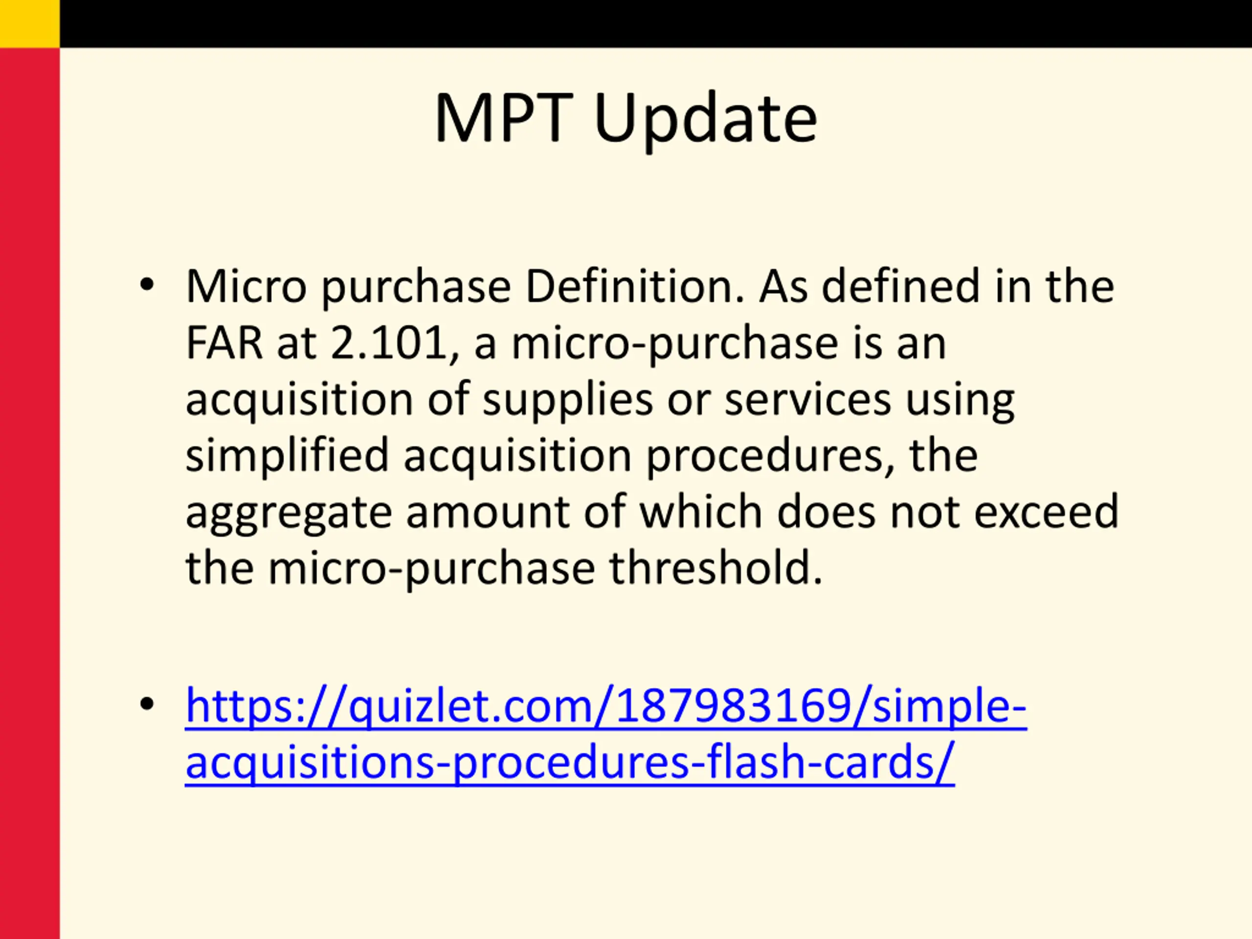 MPT Update Micro purchase Definition. As defined in the FAR at 2.101, a micro-purchase is an acquisition of supplies or services using simplified acquisition procedures, the aggregate amount of which does not exceed the micro-purchase threshold. https://quizlet.com/187983169/simple- acquisitions-procedures-flash-cards/