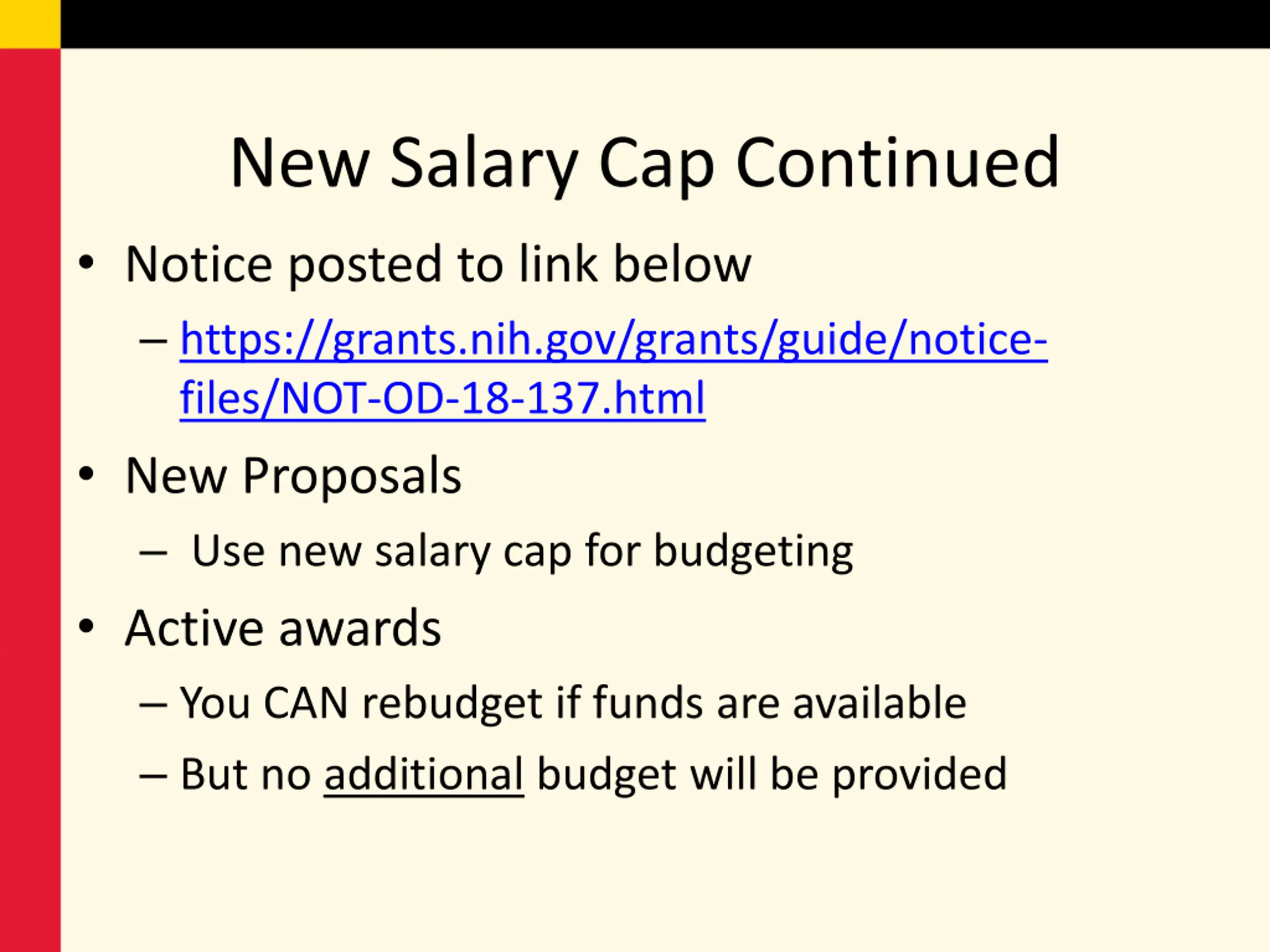 New Salary Cap Continued Notice posted to link below https://grants.nih.gov/grants/guide/notice- files/NOT-OD-18-137.html New Proposals Use new salary cap for budgeting Active awards You CAN rebudget if funds are available But no additional budget will be provided
