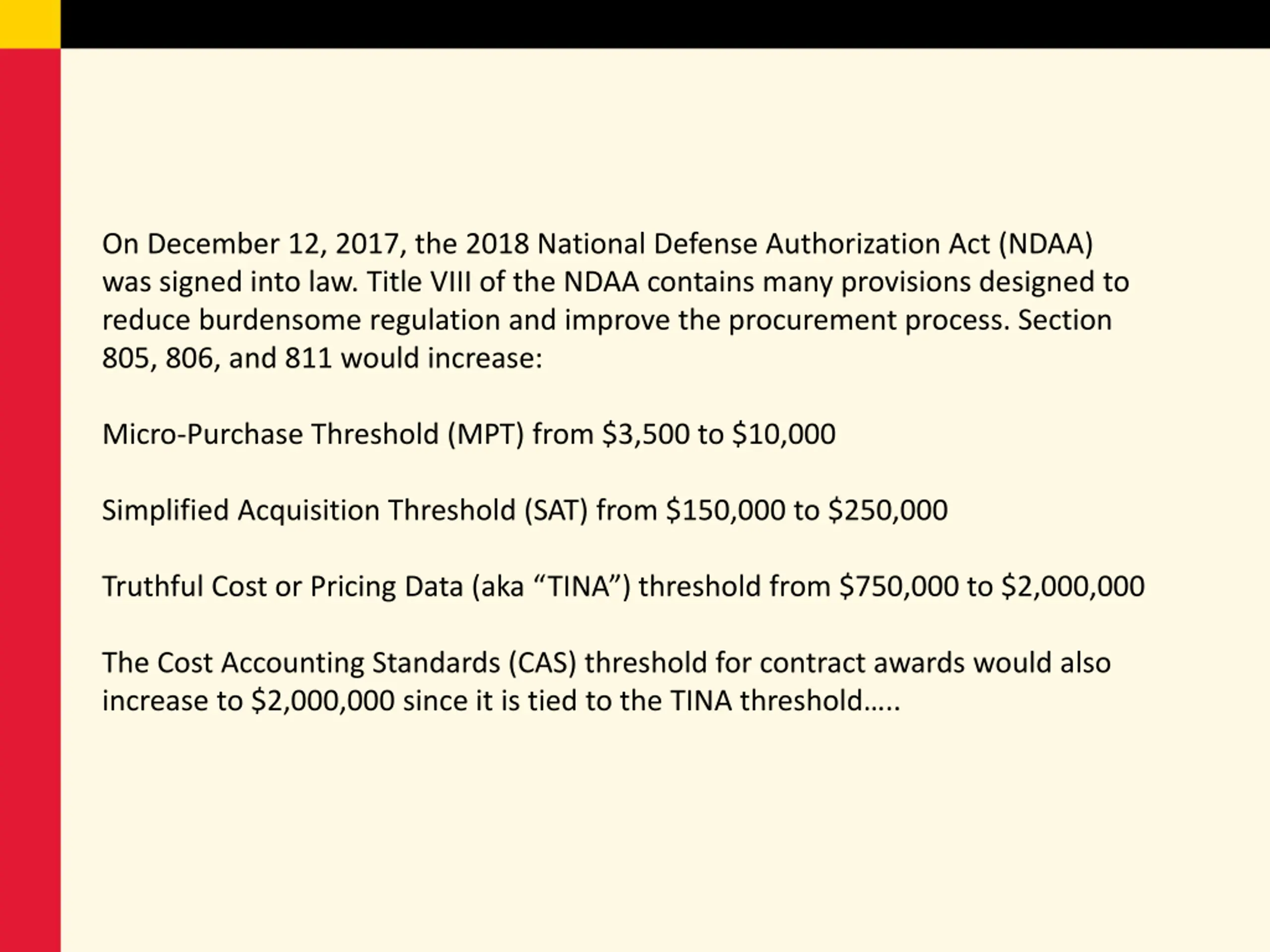 On December 12, 2017, the 2018 National Defense Authorization Act (NDAA) was signed into law. Title VIII of the NDAA contains many provisions designed to reduce burdensome regulation and improve the procurement process. Section 805, 806, and 811 would increase: Micro-Purchase Threshold (MPT) from $3,500 to $10,000 Simplified Acquisition Threshold (SAT) from $150,000 to $250,000 Truthful Cost or Pricing Data (aka TINA ) threshold from $750,000 to $2,000,000 The Cost Accounting Standards (CAS) threshold for contract awards would also increase to $2,000,000 since it is tied to the TINA threshold ..