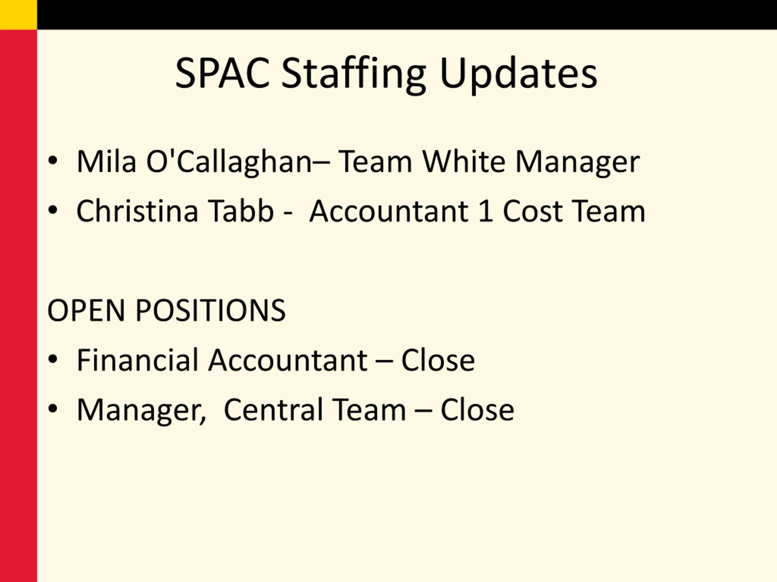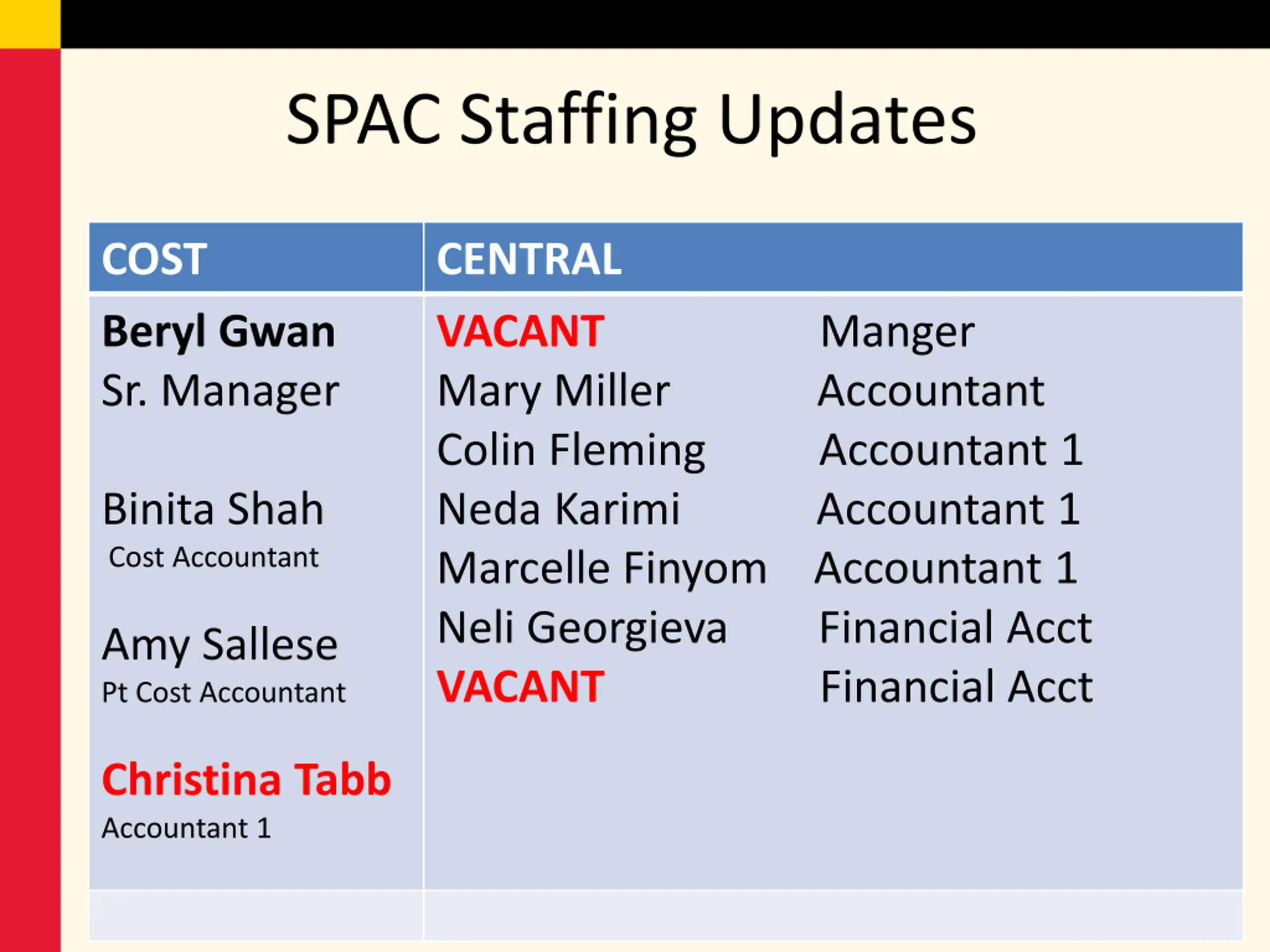 SPAC Staffing Updates COST Beryl Gwan Sr. Manager CENTRAL VACANT Manger Mary Miller Accountant Colin Fleming Accountant 1 Neda Karimi Accountant 1 Marcelle Finyom Accountant 1 Neli Georgieva Financial Acct VACANT Financial Acct Binita Shah Cost Accountant Amy Sallese Pt Cost Accountant Christina Tabb Accountant 1