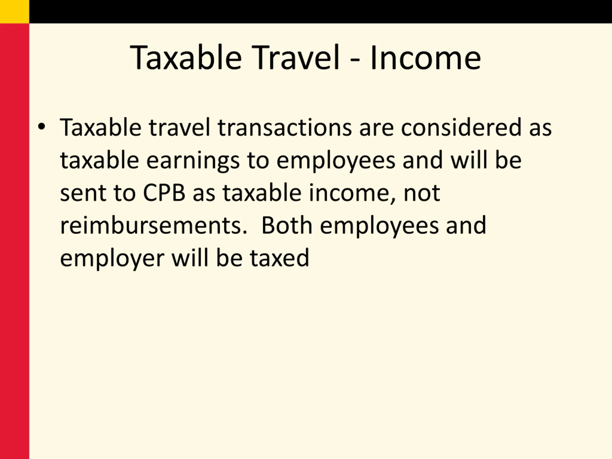 Taxable Travel - Income Taxable travel transactions are considered as taxable earnings to employees and will be sent to CPB as taxable income, not reimbursements. Both employees and employer will be taxed