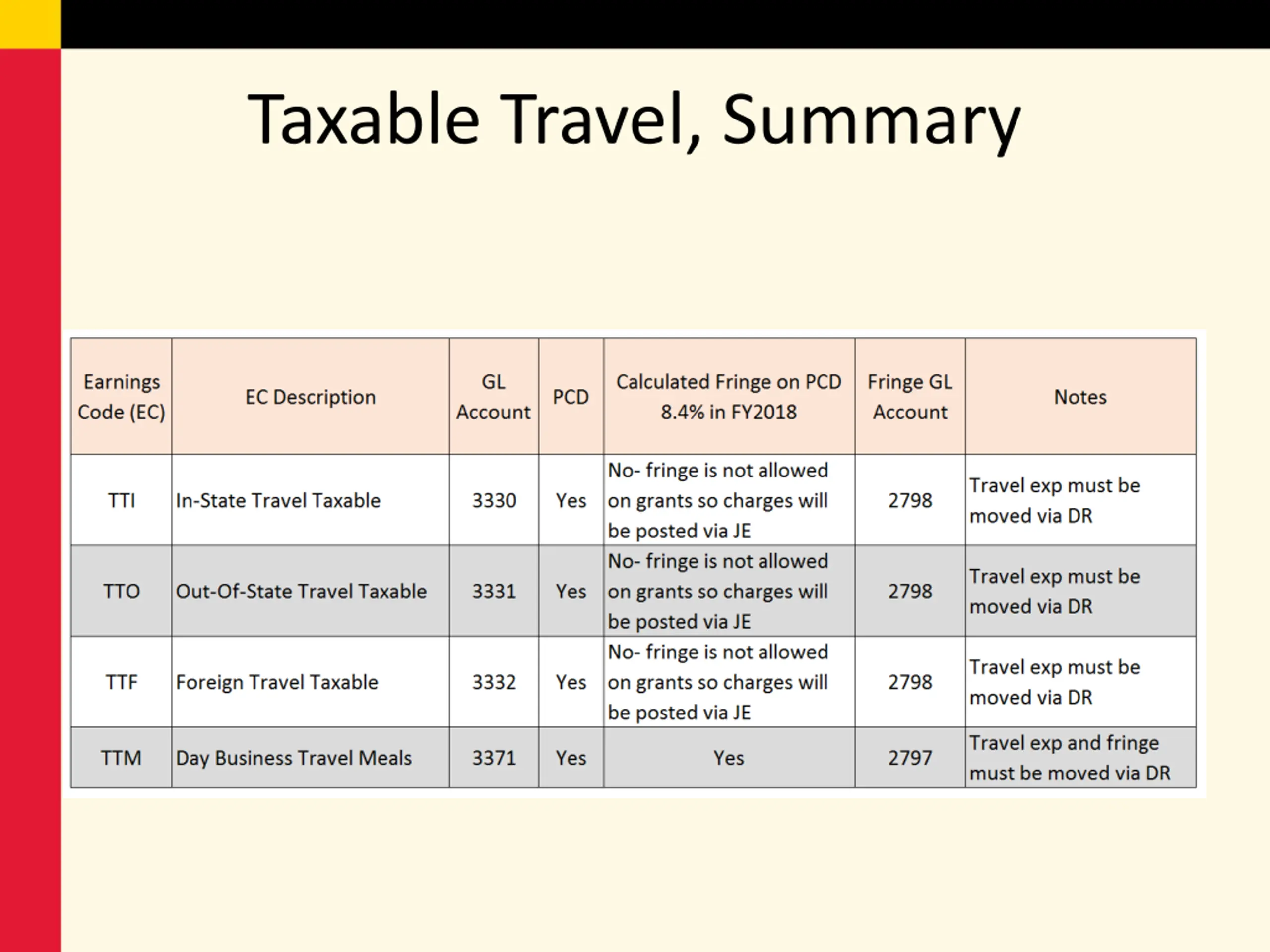 Taxable Travel Expense and Penalty Taxable Travel Expense is allowable on grants Account 3330 (Instate travel taxable) Account 3331 (Out-Of-State travel taxable) Account 3332 (Foreign travel taxable) Expense Will be posted to PCD Can only be moved via Direct Retro BUT punitive fringe expense is NOT allowable It s a penalty Fringe posted to 2798 (Fringe rate tax Late travel) Posted via journal entry Calculated Fringe rate 8.4% Will not show up on PCD