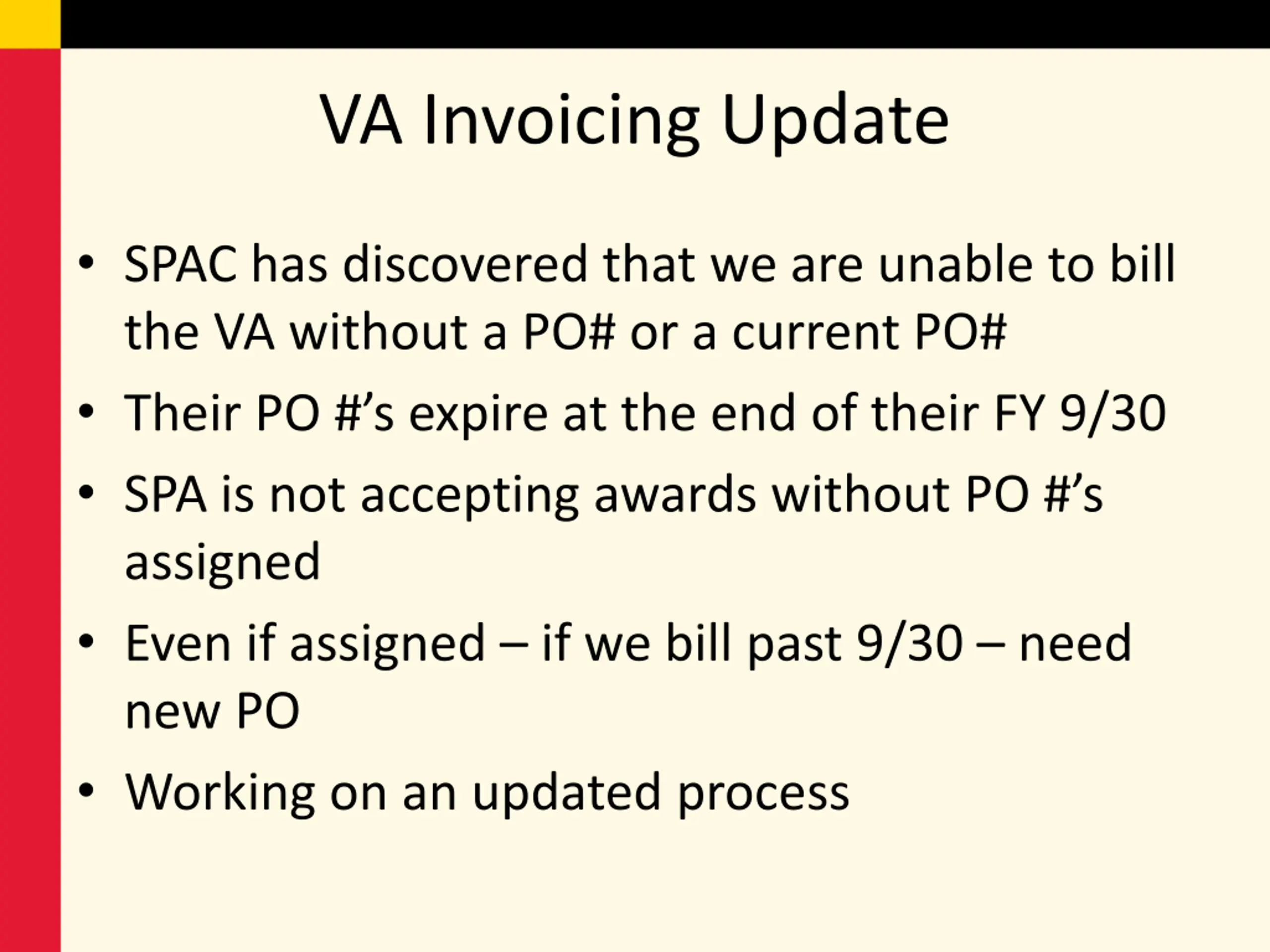 VA Invoicing Update SPAC has discovered that we are unable to bill the VA without a PO# or a current PO# Their PO # s expire at the end of their FY 9/30 SPA is not accepting awards without PO # s assigned Even if assigned if we bill past 9/30 need new PO Working on an updated process