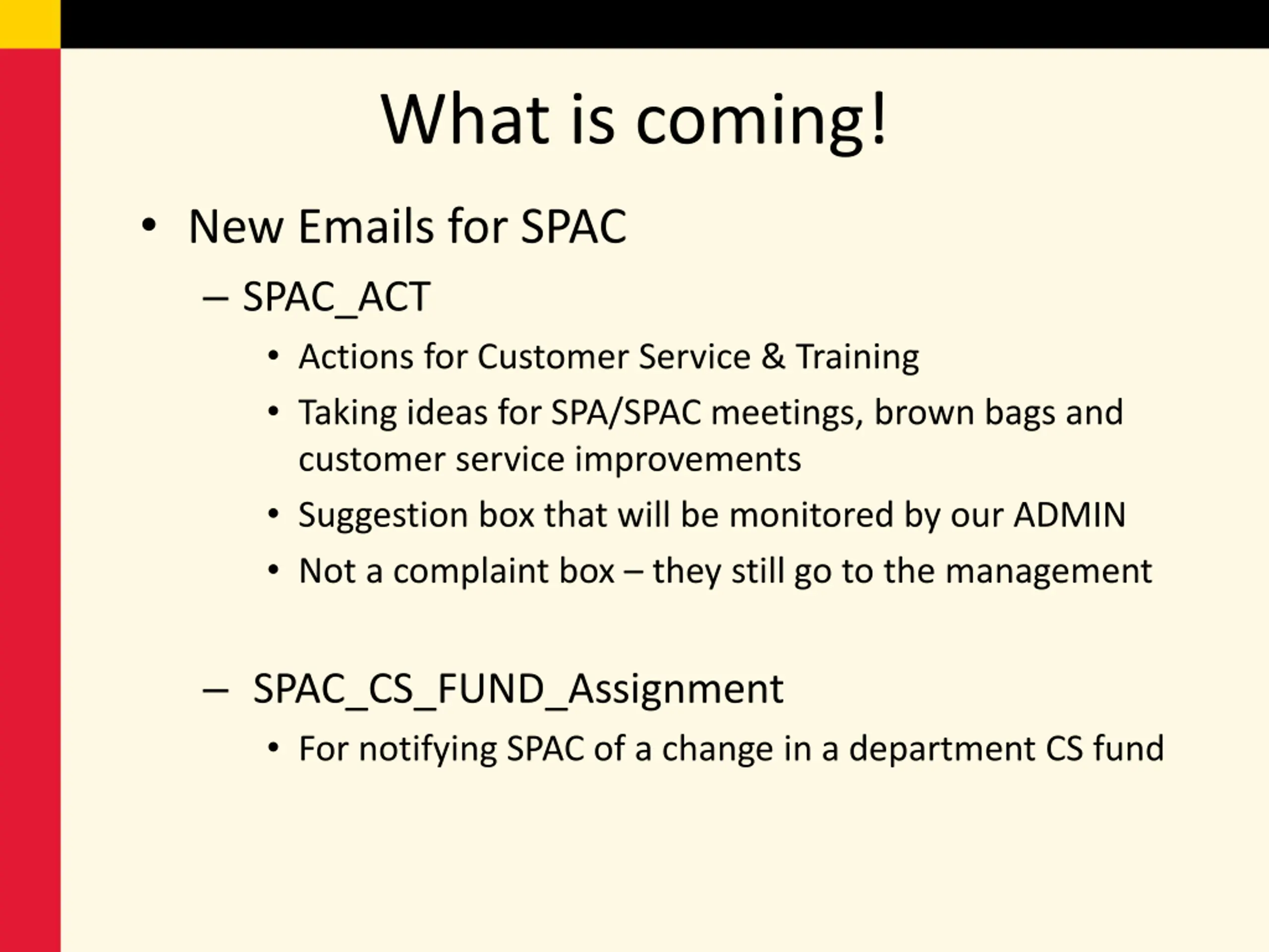What is coming! New Emails for SPAC SPAC_ACT Actions for Customer Service & Training Taking ideas for SPA/SPAC meetings, brown bags and customer service improvements Suggestion box that will be monitored by our ADMIN Not a complaint box they still go to the management SPAC_CS_FUND_Assignment For notifying SPAC of a change in a department CS fund