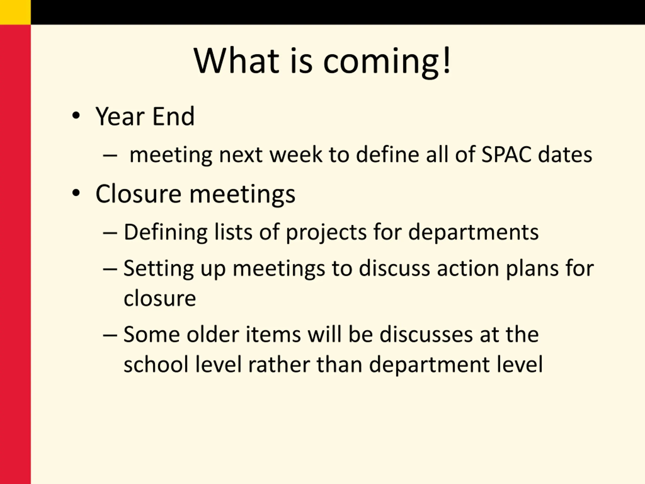 What is coming! Year End meeting next week to define all of SPAC dates Closure meetings Defining lists of projects for departments Setting up meetings to discuss action plans for closure Some older items will be discusses at the school level rather than department level
