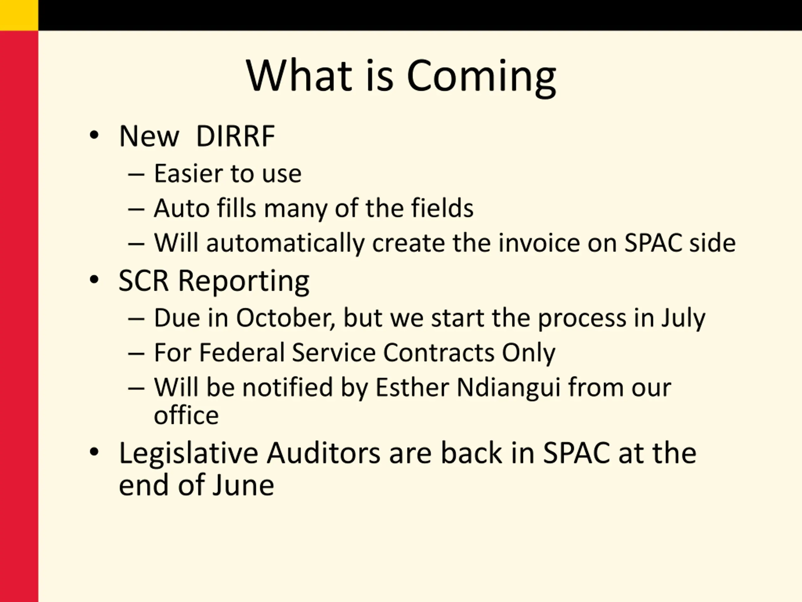 What is Coming New DIRRF Easier to use Auto fills many of the fields Will automatically create the invoice on SPAC side SCR Reporting Due in October, but we start the process in July For Federal Service Contracts Only Will be notified by Esther Ndiangui from our office Legislative Auditors are back in SPAC at the end of June