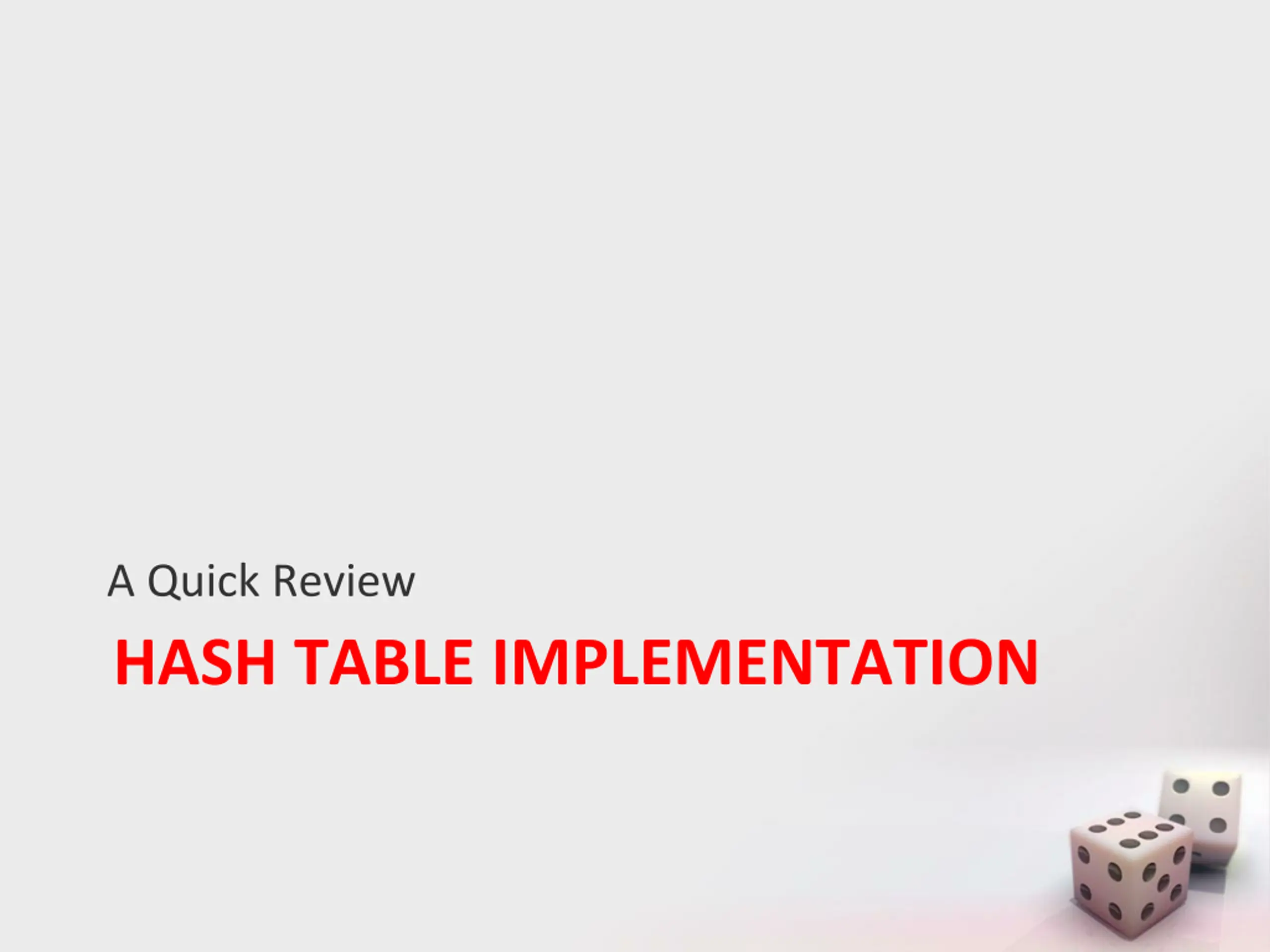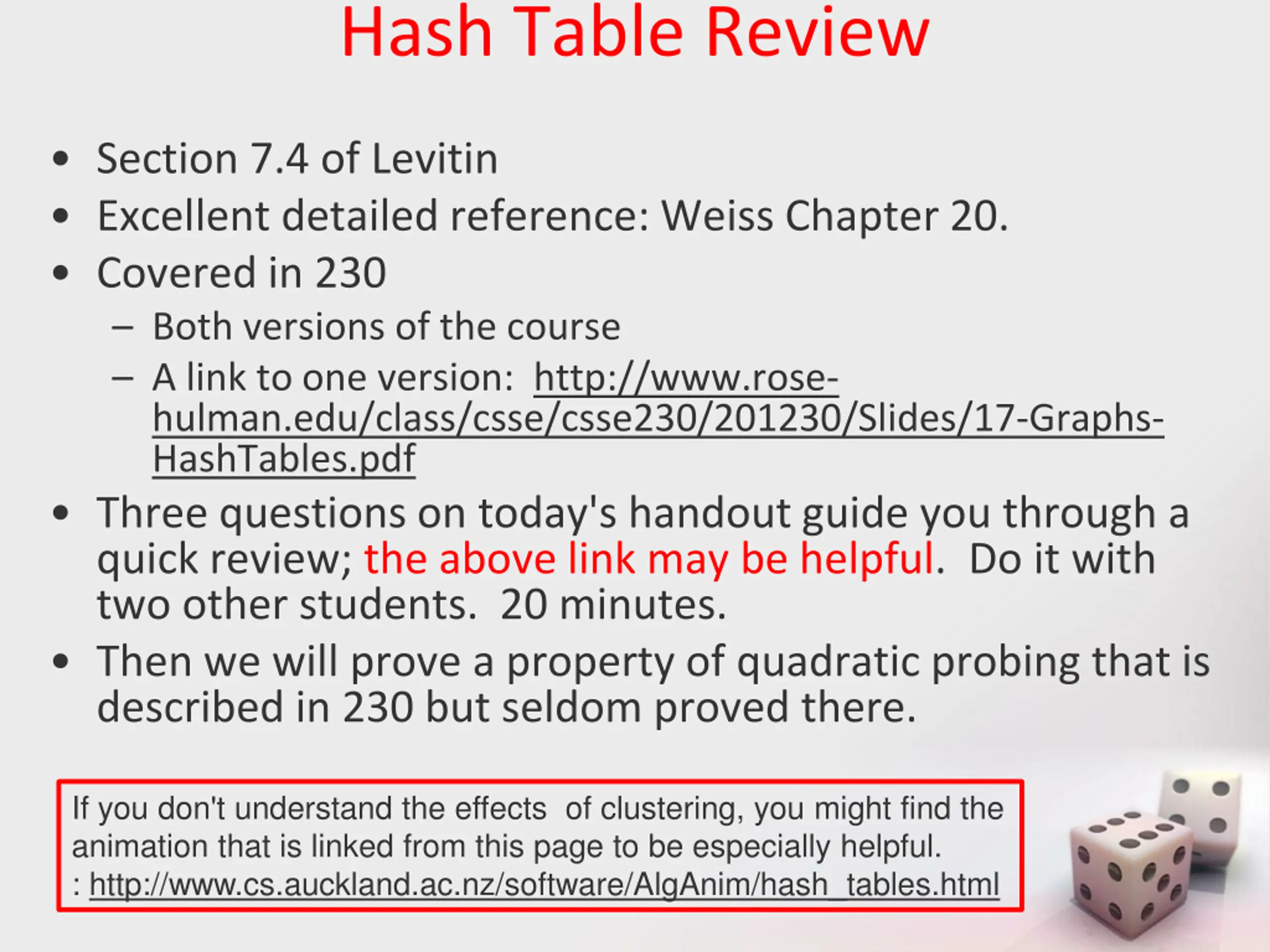 Hash Table Review Section 7.4 of Levitin Excellent detailed reference: Weiss Chapter 20. Covered in 230 Both versions of the course A link to one version: http://www.rose- hulman.edu/class/csse/csse230/201230/Slides/17-Graphs- HashTables.pdf Three questions on today's handout guide you through a quick review; the above link may be helpful. Do it with two other students. 20 minutes. Then we will prove a property of quadratic probing that is described in 230 but seldom proved there. If you don't understand the effects of clustering, you might find the animation that is linked from this page to be especially helpful. : http://www.cs.auckland.ac.nz/software/AlgAnim/hash_tables.html