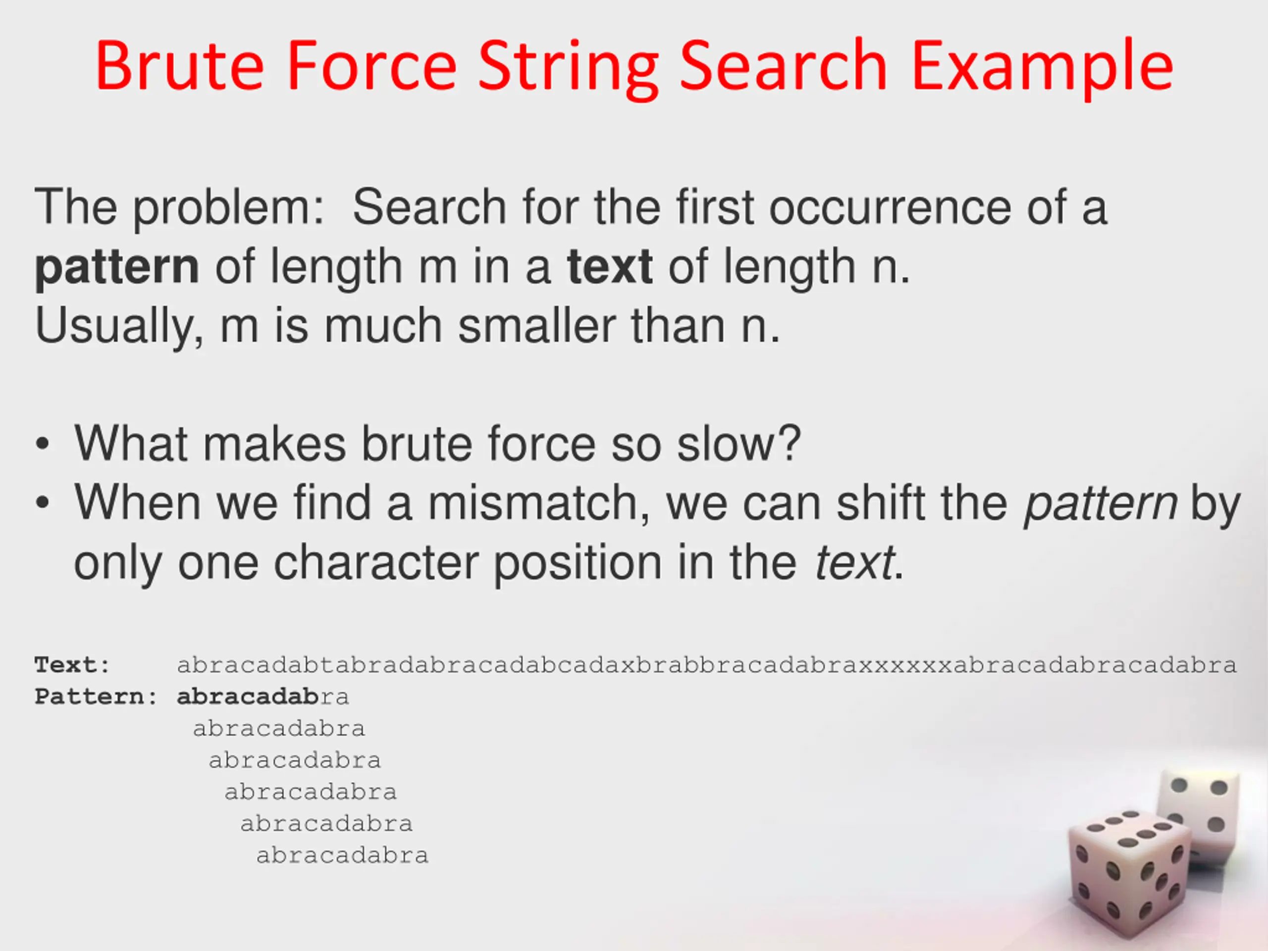 Brute Force String Search Example The problem: Search for the first occurrence of a pattern of length m in a text of length n. Usually, m is much smaller than n. What makes brute force so slow? When we find a mismatch, we can shift the pattern by only one character position in the text. Text: Pattern:abracadabra abracadabra abracadabra abracadabra abracadabra abracadabra abracadabtabradabracadabcadaxbrabbracadabraxxxxxxabracadabracadabra