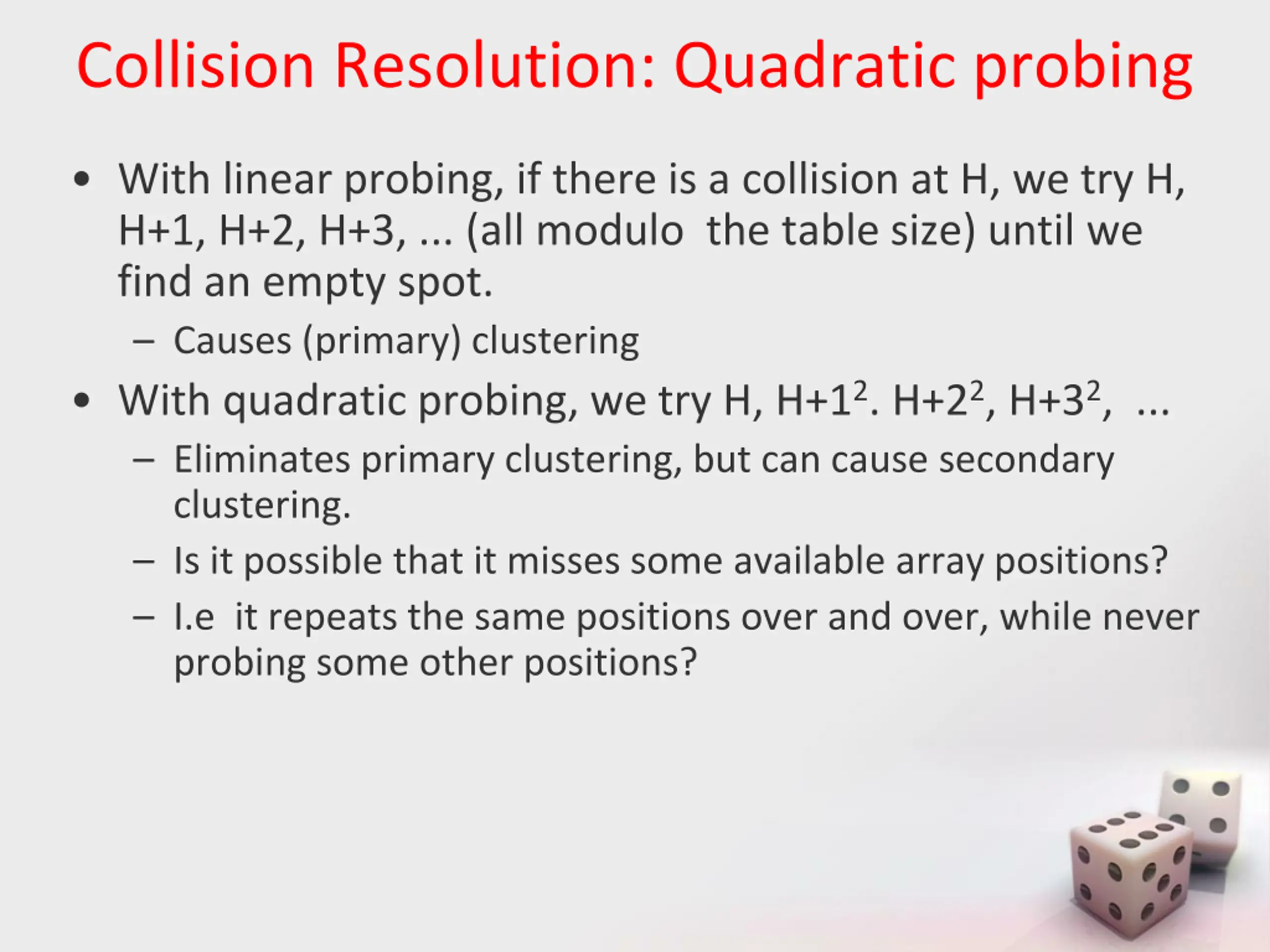 Collision Resolution: Quadratic probing With linear probing, if there is a collision at H, we try H, H+1, H+2, H+3, ... (all modulo the table size) until we find an empty spot. Causes (primary) clustering With quadratic probing, we try H, H+12. H+22, H+32, ... Eliminates primary clustering, but can cause secondary clustering. Is it possible that it misses some available array positions? I.e it repeats the same positions over and over, while never probing some other positions?