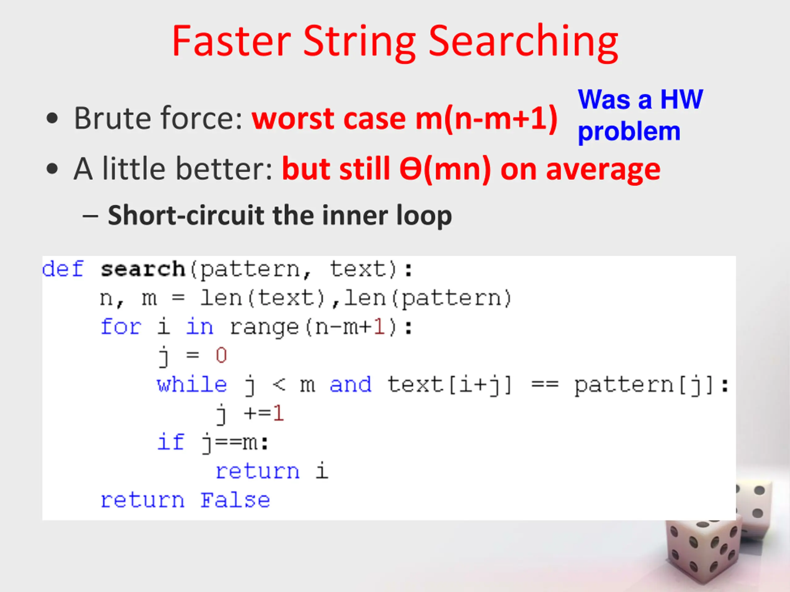 Faster String Searching Was a HW problem Brute force: worst case m(n-m+1) A little better: but still (mn) on average Short-circuit the inner loop