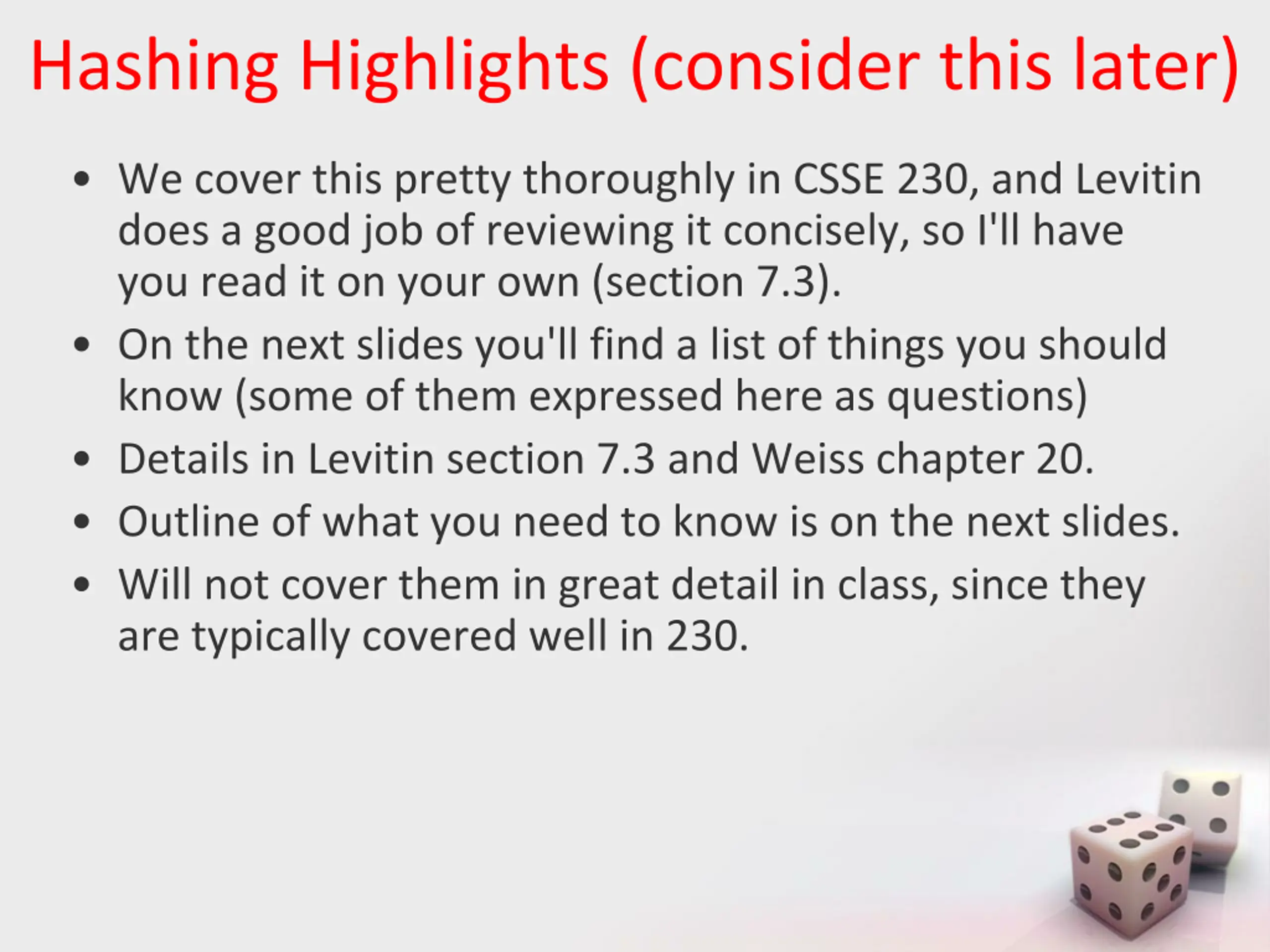 Hashing Highlights (consider this later) We cover this pretty thoroughly in CSSE 230, and Levitin does a good job of reviewing it concisely, so I'll have you read it on your own (section 7.3). On the next slides you'll find a list of things you should know (some of them expressed here as questions) Details in Levitin section 7.3 and Weiss chapter 20. Outline of what you need to know is on the next slides. Will not cover them in great detail in class, since they are typically covered well in 230.