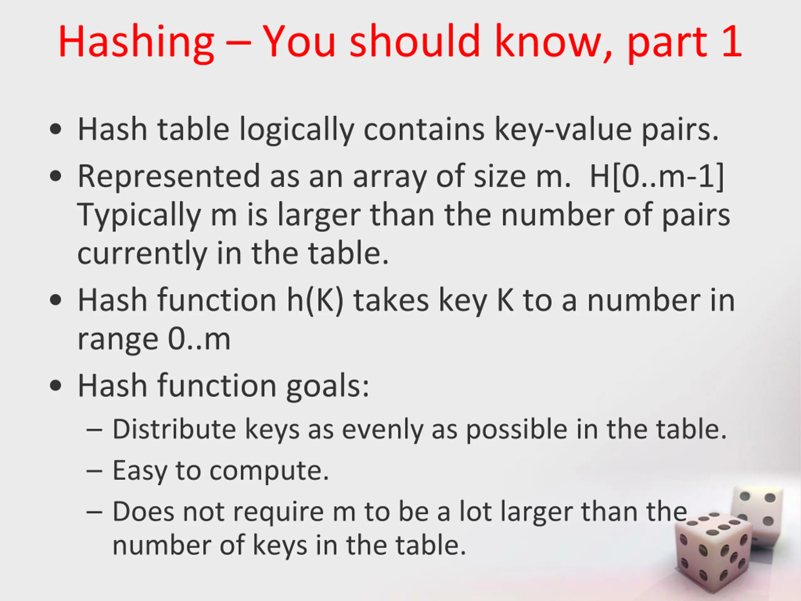 Hashing You should know, part 1 Hash table logically contains key-value pairs. Represented as an array of size m. H[0..m-1] Typically m is larger than the number of pairs currently in the table. Hash function h(K) takes key K to a number in range 0..m Hash function goals: Distribute keys as evenly as possible in the table. Easy to compute. Does not require m to be a lot larger than the number of keys in the table.