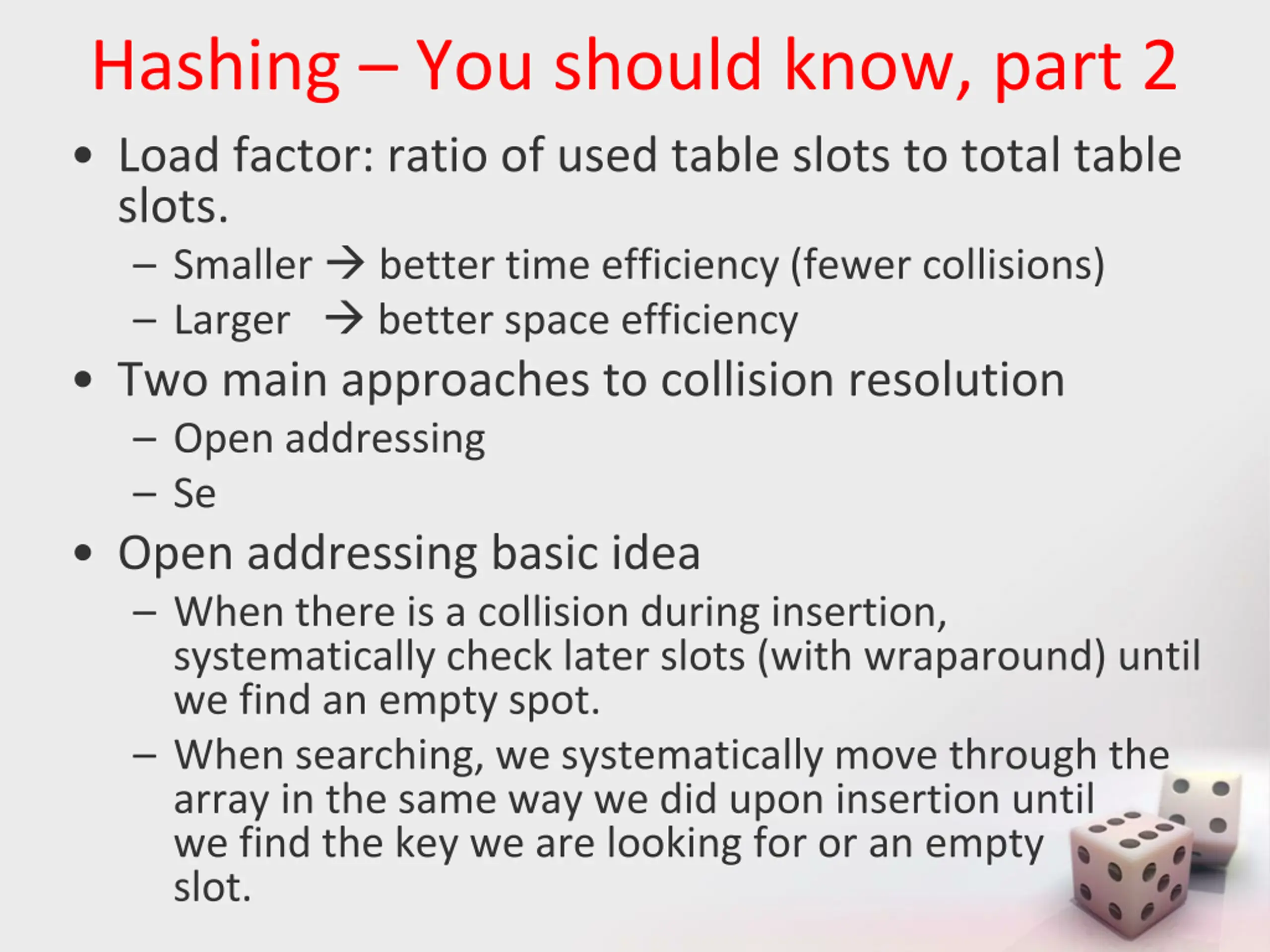 Hashing You should know, part 2 Load factor: ratio of used table slots to total table slots. Smaller better time efficiency (fewer collisions) Larger better space efficiency Two main approaches to collision resolution Open addressing Se Open addressing basic idea When there is a collision during insertion, systematically check later slots (with wraparound) until we find an empty spot. When searching, we systematically move through the array in the same way we did upon insertion until we find the key we are looking for or an empty slot.