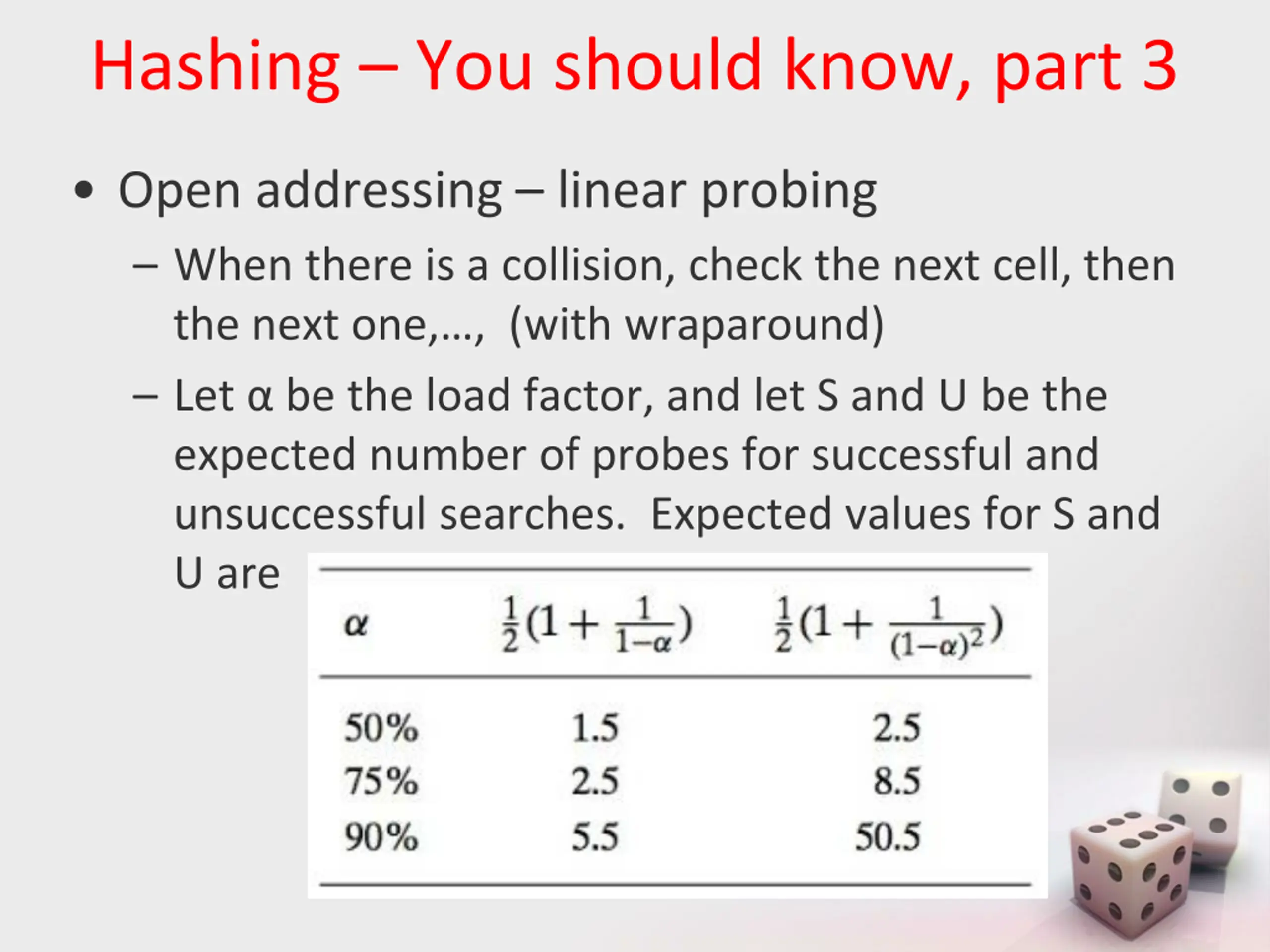 Hashing You should know, part 3 Open addressing linear probing When there is a collision, check the next cell, then the next one, , (with wraparound) Let be the load factor, and let S and U be the expected number of probes for successful and unsuccessful searches. Expected values for S and U are