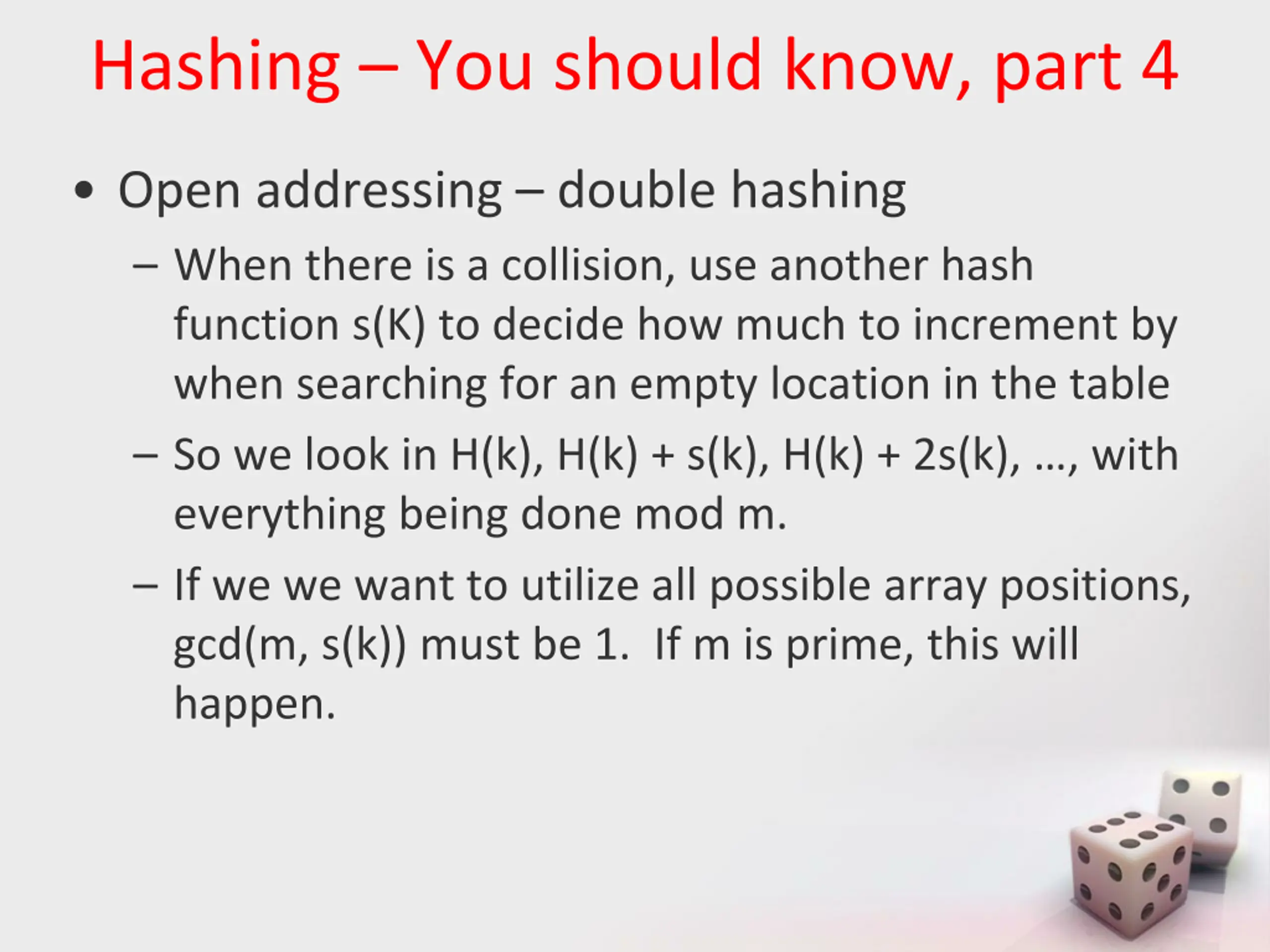 Hashing You should know, part 4 Open addressing double hashing When there is a collision, use another hash function s(K) to decide how much to increment by when searching for an empty location in the table So we look in H(k), H(k) + s(k), H(k) + 2s(k), , with everything being done mod m. If we we want to utilize all possible array positions, gcd(m, s(k)) must be 1. If m is prime, this will happen.