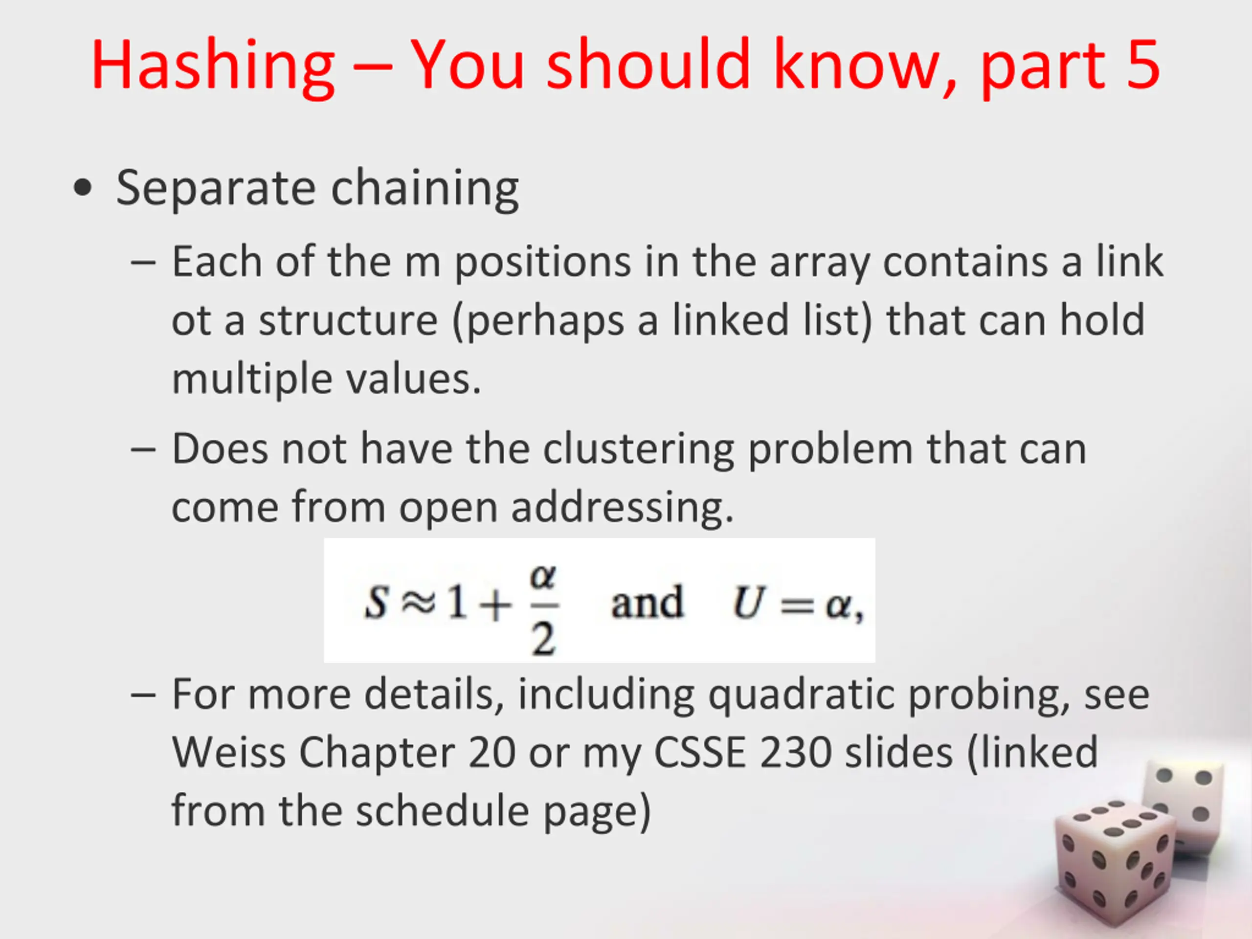 Hashing You should know, part 5 Separate chaining Each of the m positions in the array contains a link ot a structure (perhaps a linked list) that can hold multiple values. Does not have the clustering problem that can come from open addressing. For more details, including quadratic probing, see Weiss Chapter 20 or my CSSE 230 slides (linked from the schedule page)