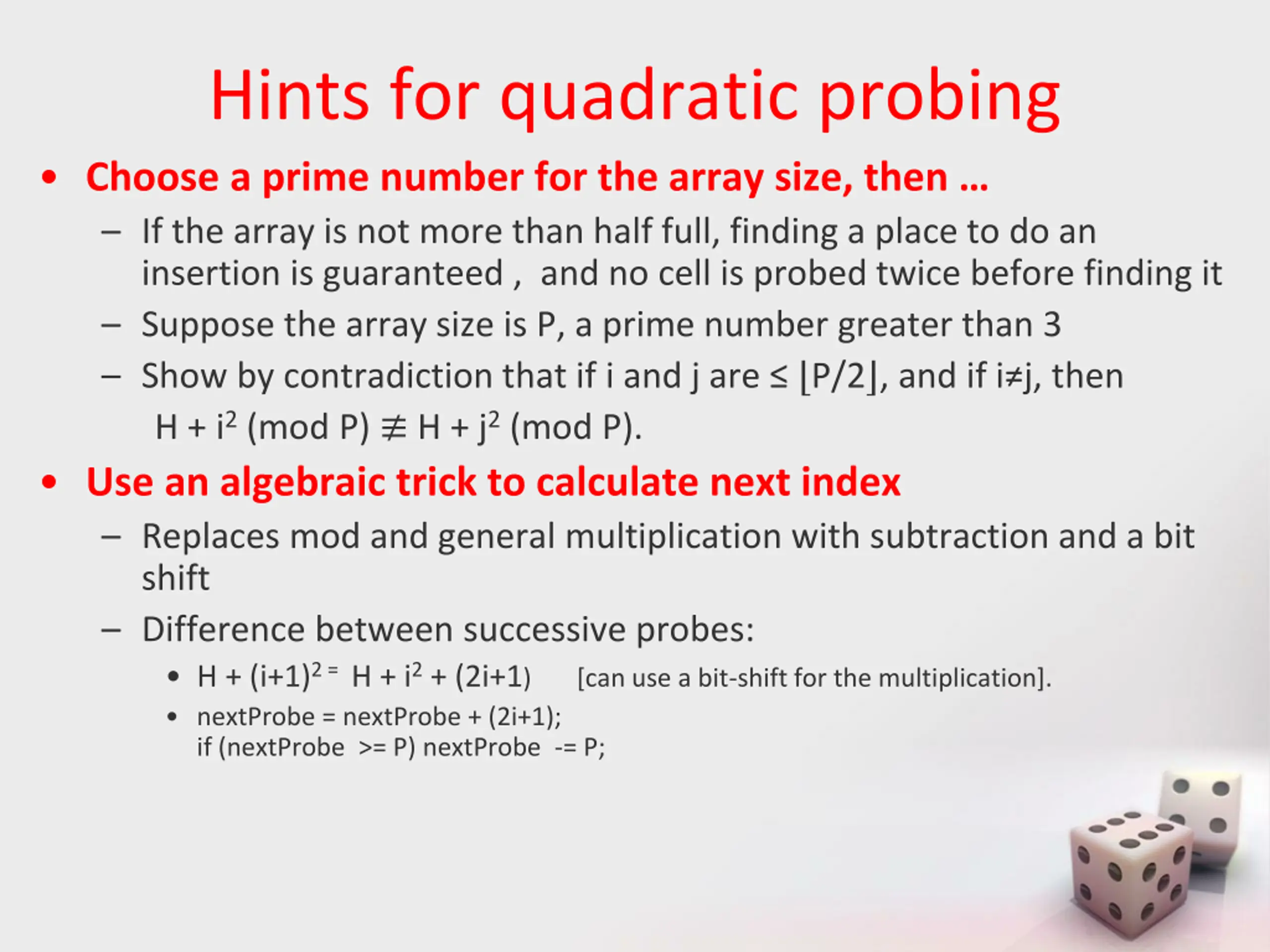 Hints for quadratic probing Choose a prime number for the array size, then If the array is not more than half full, finding a place to do an insertion is guaranteed , and no cell is probed twice before finding it Suppose the array size is P, a prime number greater than 3 Show by contradiction that if i and j are P/2 , and if i j, then H + i2 (mod P) H + j2 (mod P). Use an algebraic trick to calculate next index Replaces mod and general multiplication with subtraction and a bit shift Difference between successive probes: H + (i+1)2 = H + i2 + (2i+1) [can use a bit-shift for the multiplication]. nextProbe = nextProbe + (2i+1); if (nextProbe >= P) nextProbe -= P;