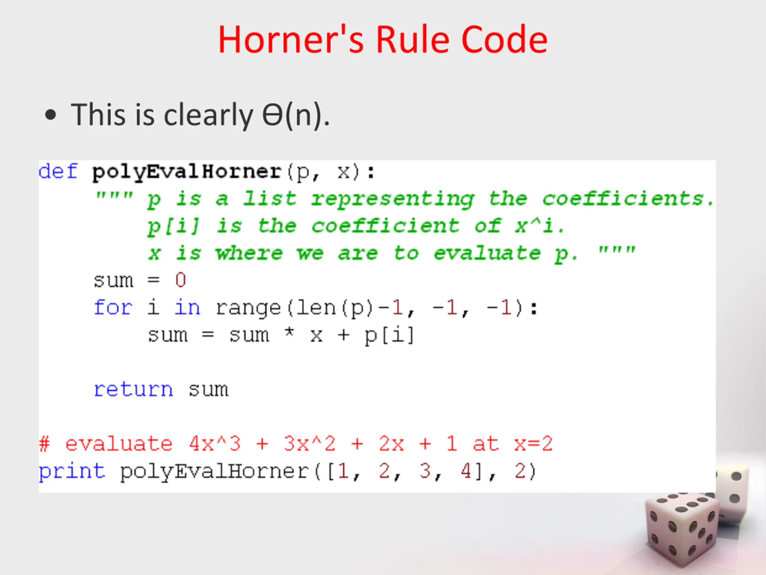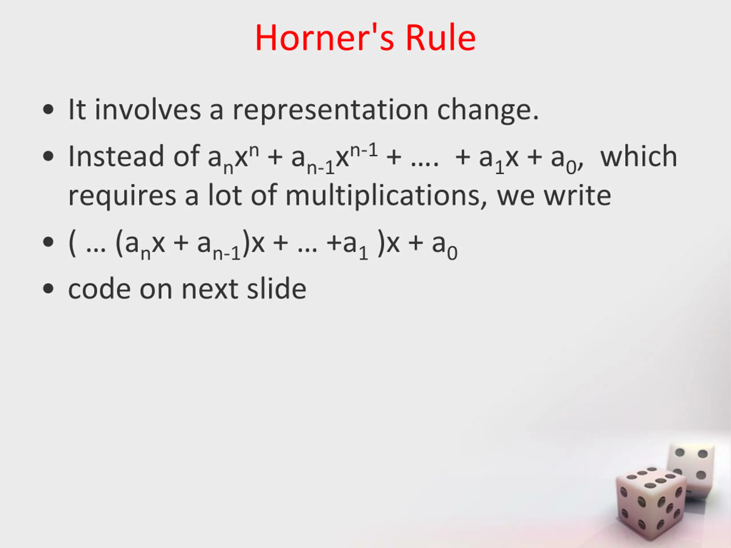 Horner's Rule It involves a representation change. Instead of anxn + an-1xn-1+ . + a1x + a0, which requires a lot of multiplications, we write ( (anx + an-1)x + +a1 )x + a0 code on next slide