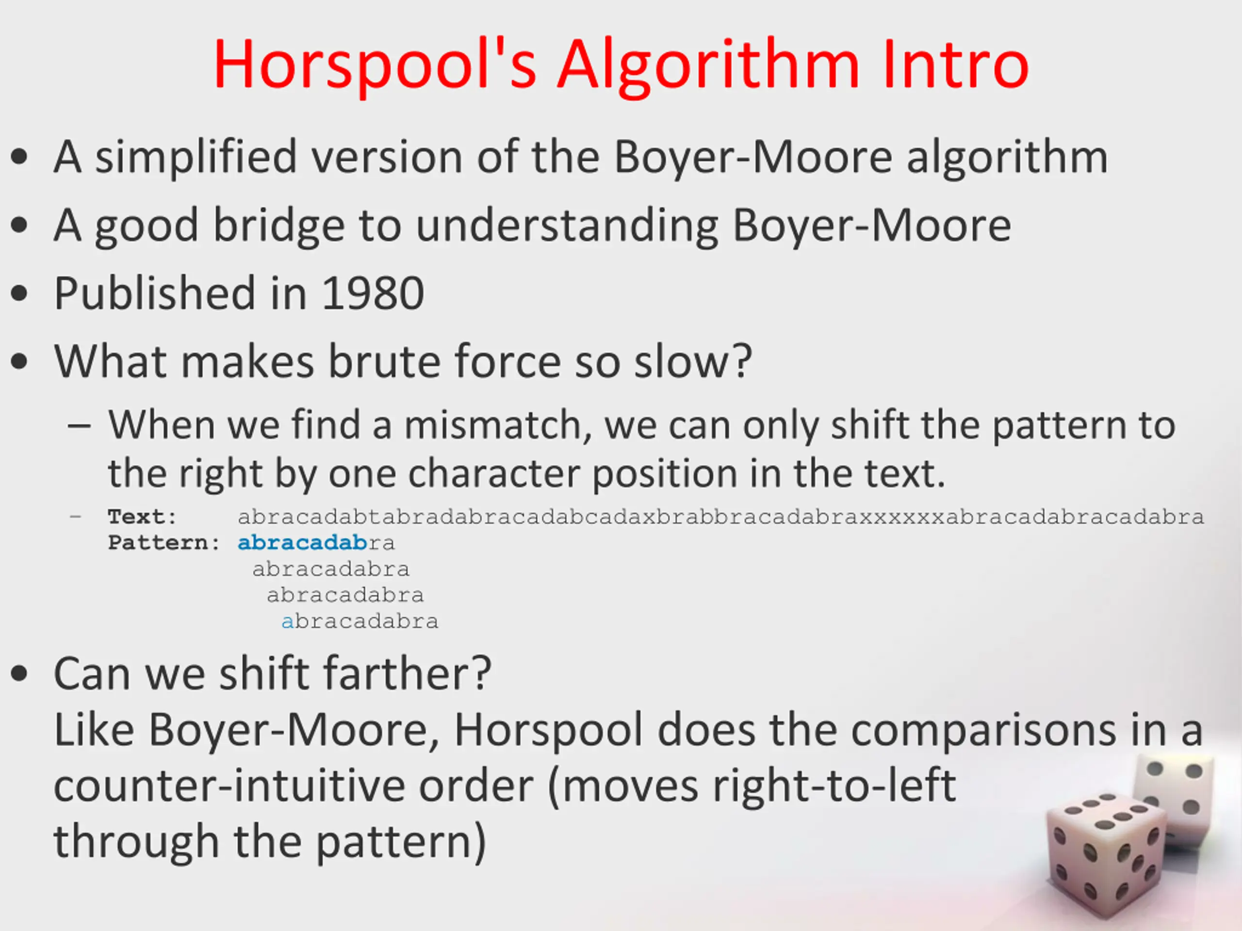 Horspool's Algorithm Intro A simplified version of the Boyer-Moore algorithm A good bridge to understanding Boyer-Moore Published in 1980 What makes brute force so slow? When we find a mismatch, we can only shift the pattern to the right by one character position in the text. Text: abracadabtabradabracadabcadaxbrabbracadabraxxxxxxabracadabracadabra Pattern:abracadabra abracadabra abracadabra abracadabra Can we shift farther? Like Boyer-Moore, Horspool does the comparisons in a counter-intuitive order (moves right-to-left through the pattern)