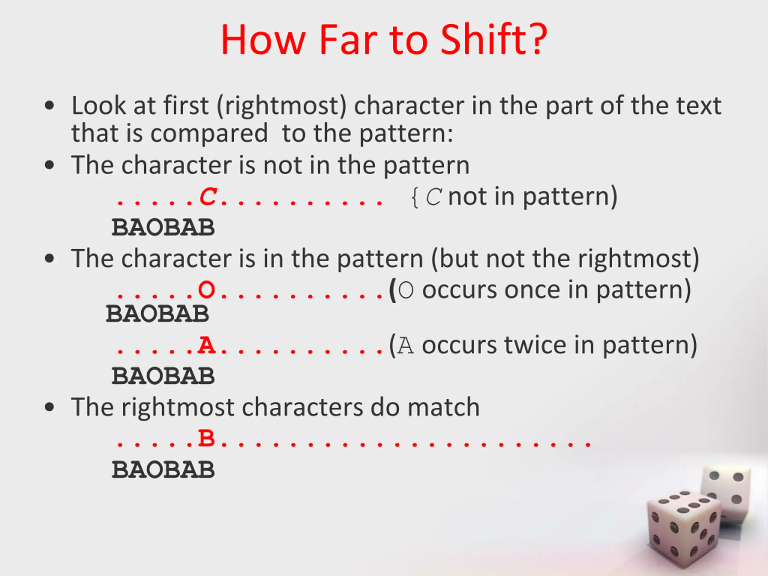 How Far to Shift? Look at first (rightmost) character in the part of the text that is compared to the pattern: The character is not in the pattern .....C.......... {C not in pattern) BAOBAB The character is in the pattern (but not the rightmost) .....O..........(O occurs once in pattern) BAOBAB .....A..........(A occurs twice in pattern) BAOBAB The rightmost characters do match .....B...................... BAOBAB
