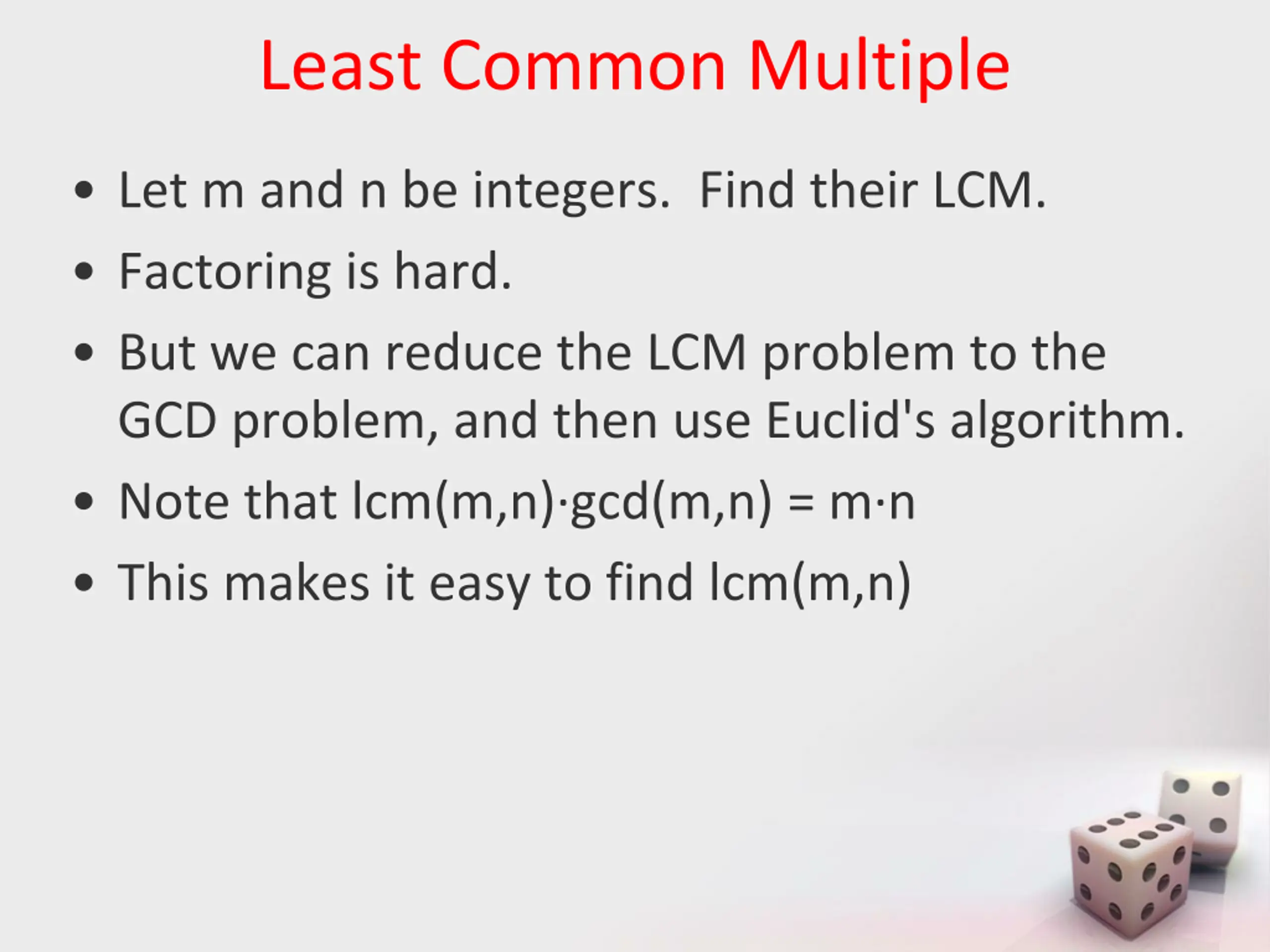 Least Common Multiple Let m and n be integers. Find their LCM. Factoring is hard. But we can reduce the LCM problem to the GCD problem, and then use Euclid's algorithm. Note that lcm(m,n) gcd(m,n) = m n This makes it easy to find lcm(m,n)