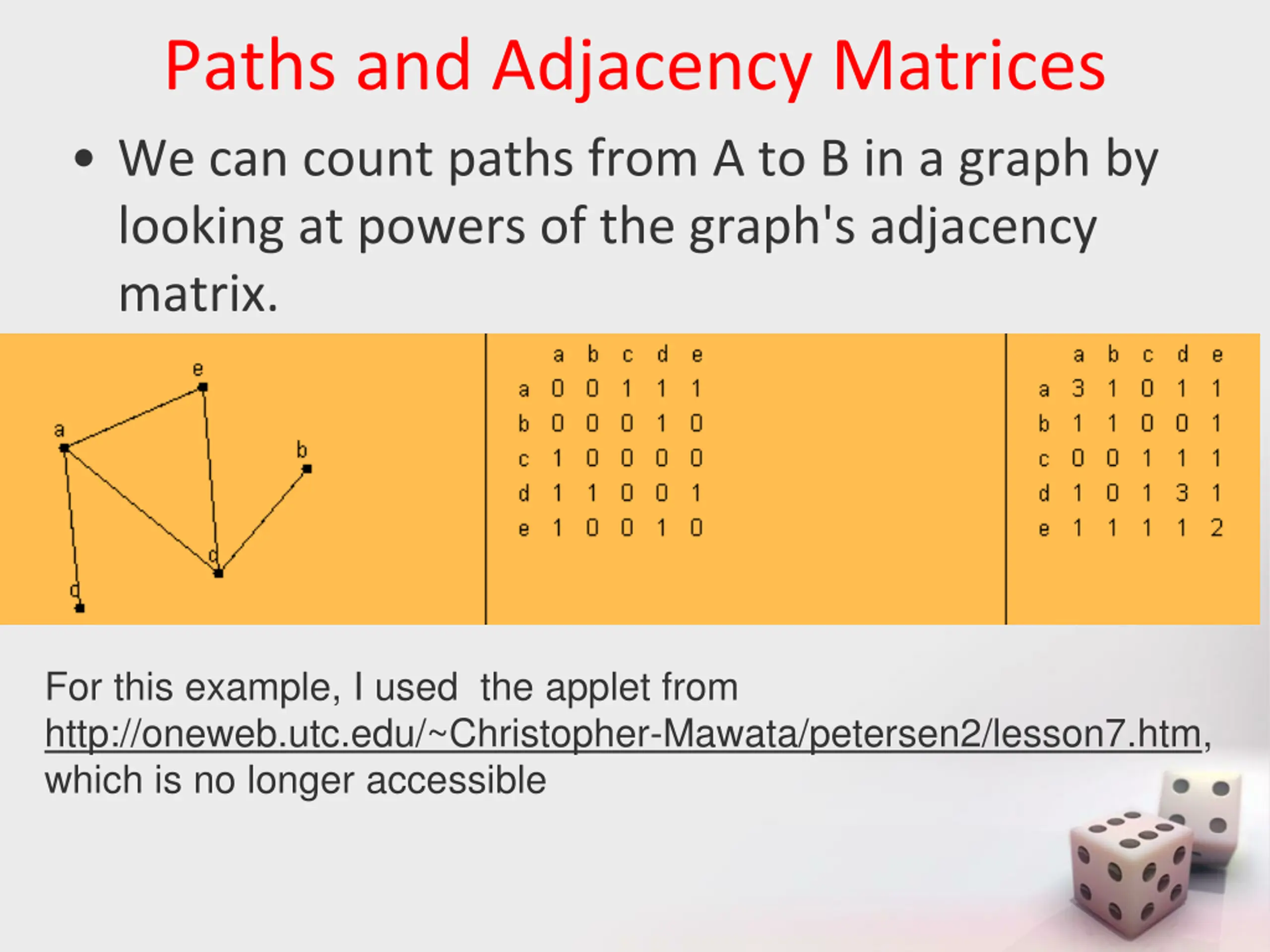 Paths and Adjacency Matrices We can count paths from A to B in a graph by looking at powers of the graph's adjacency matrix. For this example, I used the applet from http://oneweb.utc.edu/~Christopher-Mawata/petersen2/lesson7.htm, which is no longer accessible