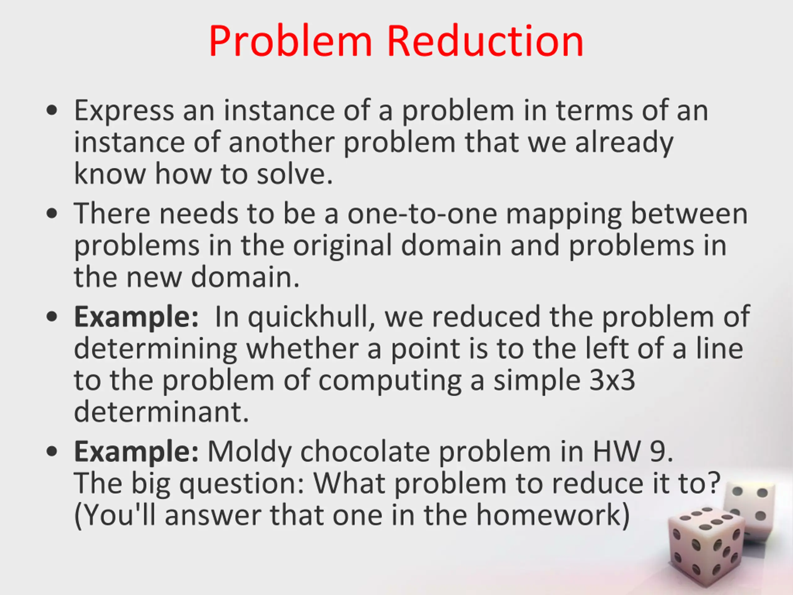 Problem Reduction Express an instance of a problem in terms of an instance of another problem that we already know how to solve. There needs to be a one-to-one mapping between problems in the original domain and problems in the new domain. Example: In quickhull, we reduced the problem of determining whether a point is to the left of a line to the problem of computing a simple 3x3 determinant. Example: Moldy chocolate problem in HW 9. The big question: What problem to reduce it to? (You'll answer that one in the homework)