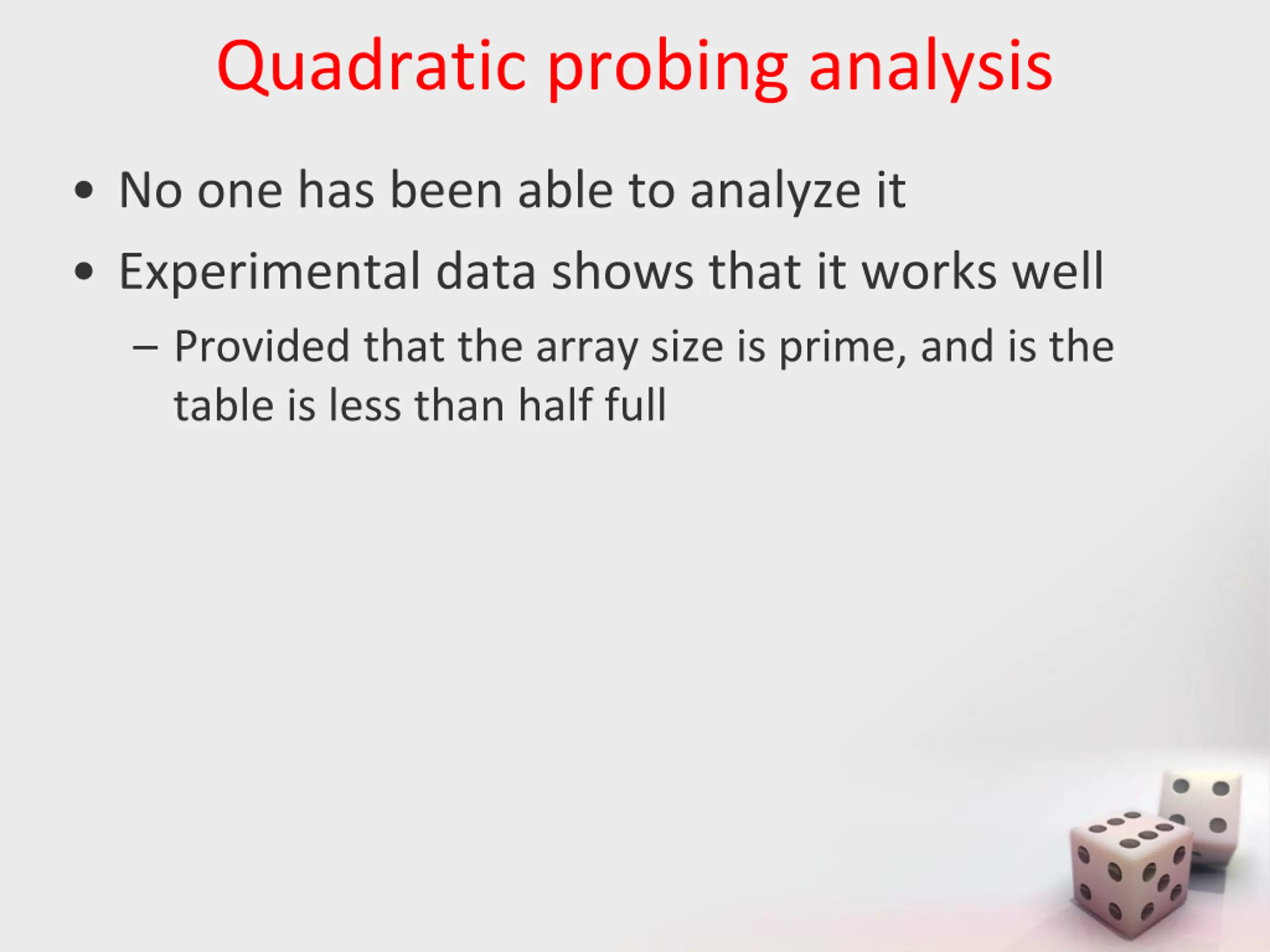 Quadratic probing analysis No one has been able to analyze it Experimental data shows that it works well Provided that the array size is prime, and is the table is less than half full