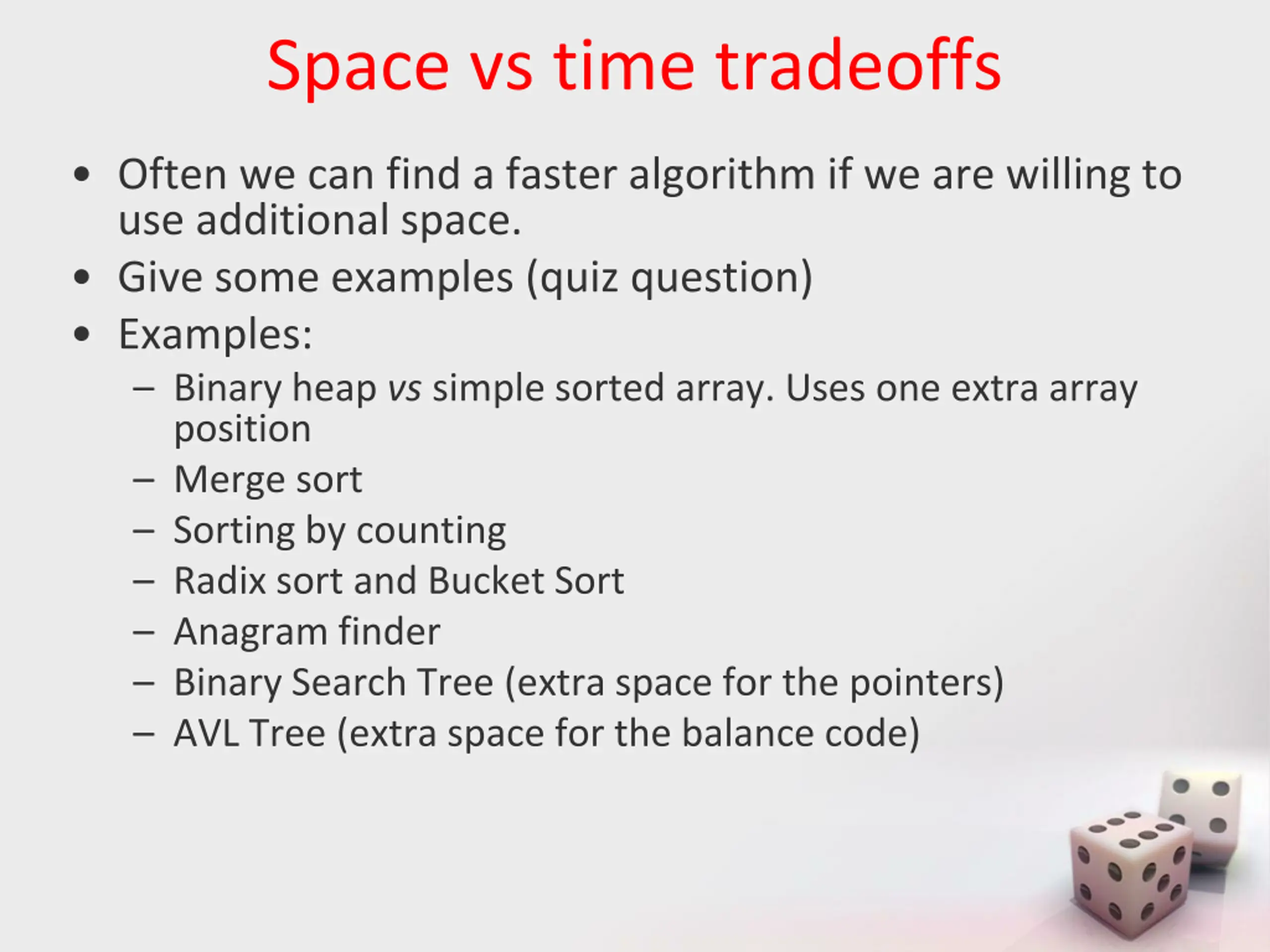 Space vs time tradeoffs Often we can find a faster algorithm if we are willing to use additional space. Give some examples (quiz question) Examples: Binary heap vs simple sorted array. Uses one extra array position Merge sort Sorting by counting Radix sort and Bucket Sort Anagram finder Binary Search Tree (extra space for the pointers) AVL Tree (extra space for the balance code)