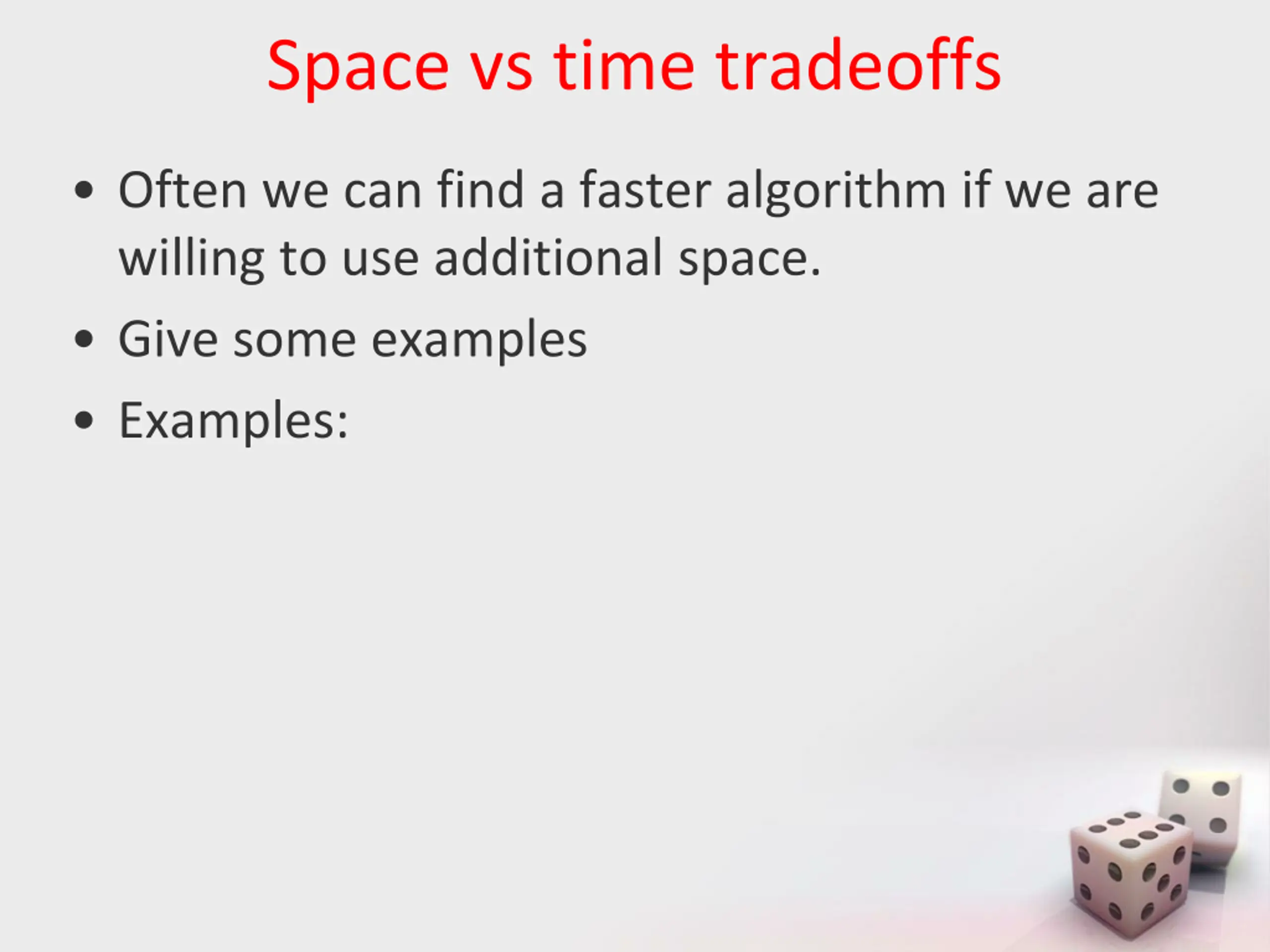 Space vs time tradeoffs Often we can find a faster algorithm if we are willing to use additional space. Give some examples Examples: