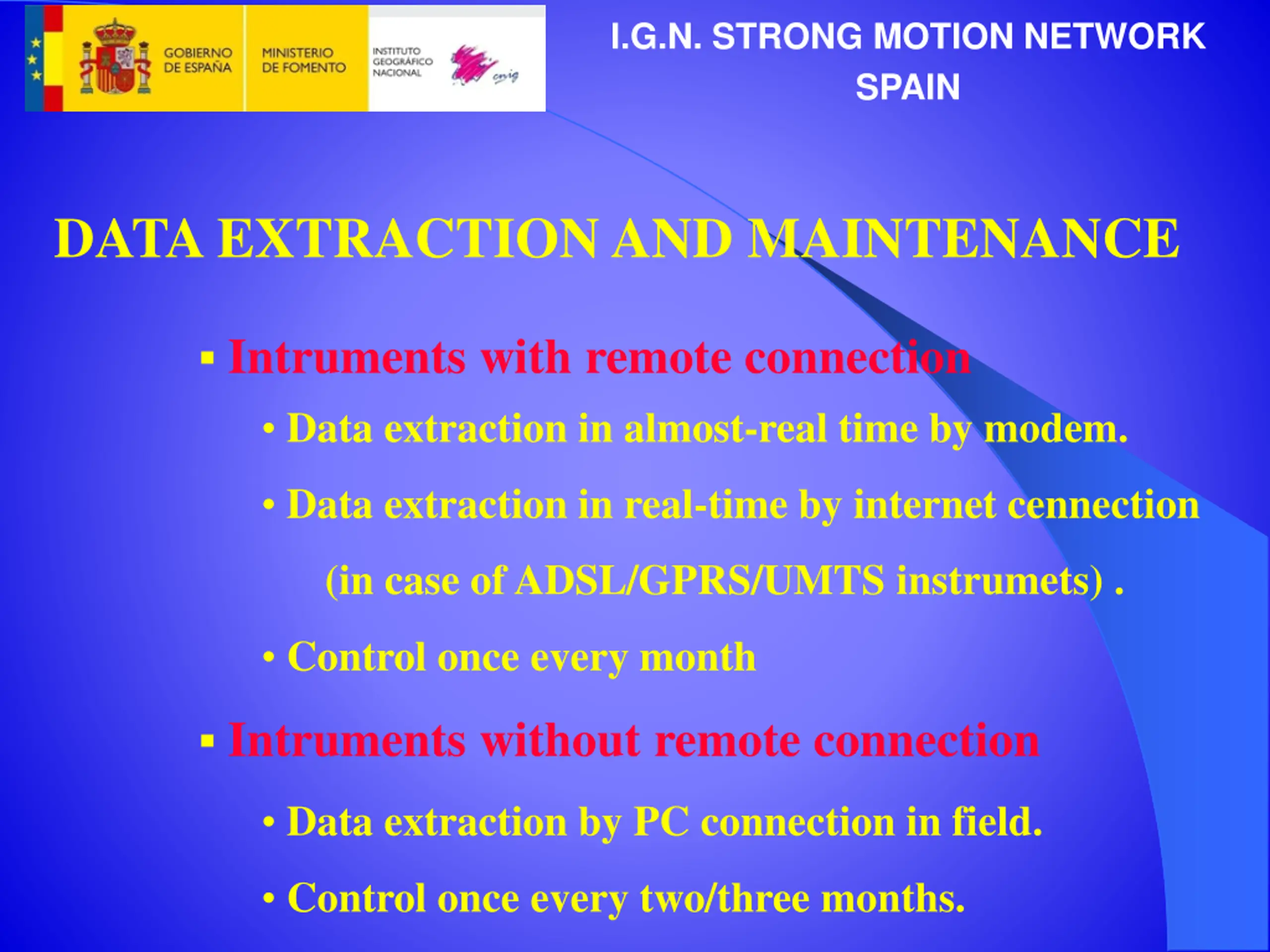 I.G.N. STRONG MOTION NETWORK SPAIN DATA EXTRACTION AND MAINTENANCE Intruments with remote connection Data extraction in almost-real time by modem. Data extraction in real-time by internet cennection (in case of ADSL/GPRS/UMTS instrumets) . Control once every month Intruments without remote connection Data extraction by PC connection in field. Control once every two/three months.