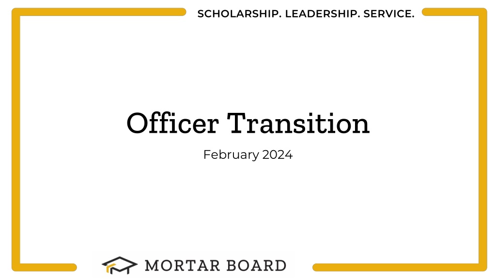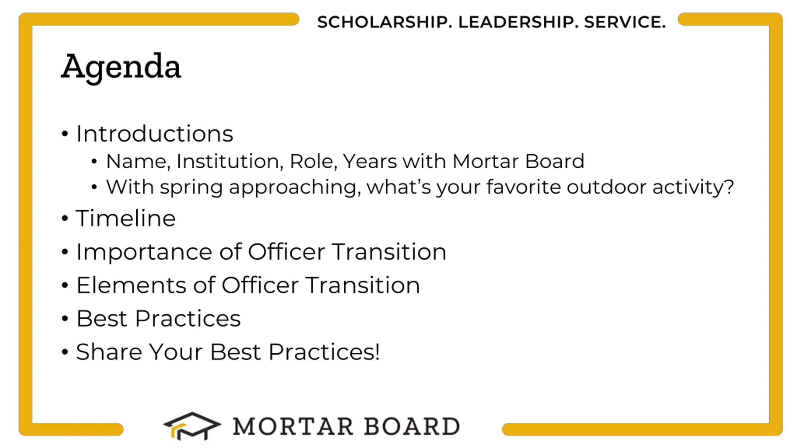 SCHOLARSHIP. LEADERSHIP. SERVICE. Agenda Introductions Name, Institution, Role, Years with Mortar Board With spring approaching, what s your favorite outdoor activity? Timeline Importance of Officer Transition Elements of Officer Transition Best Practices Share Your Best Practices!