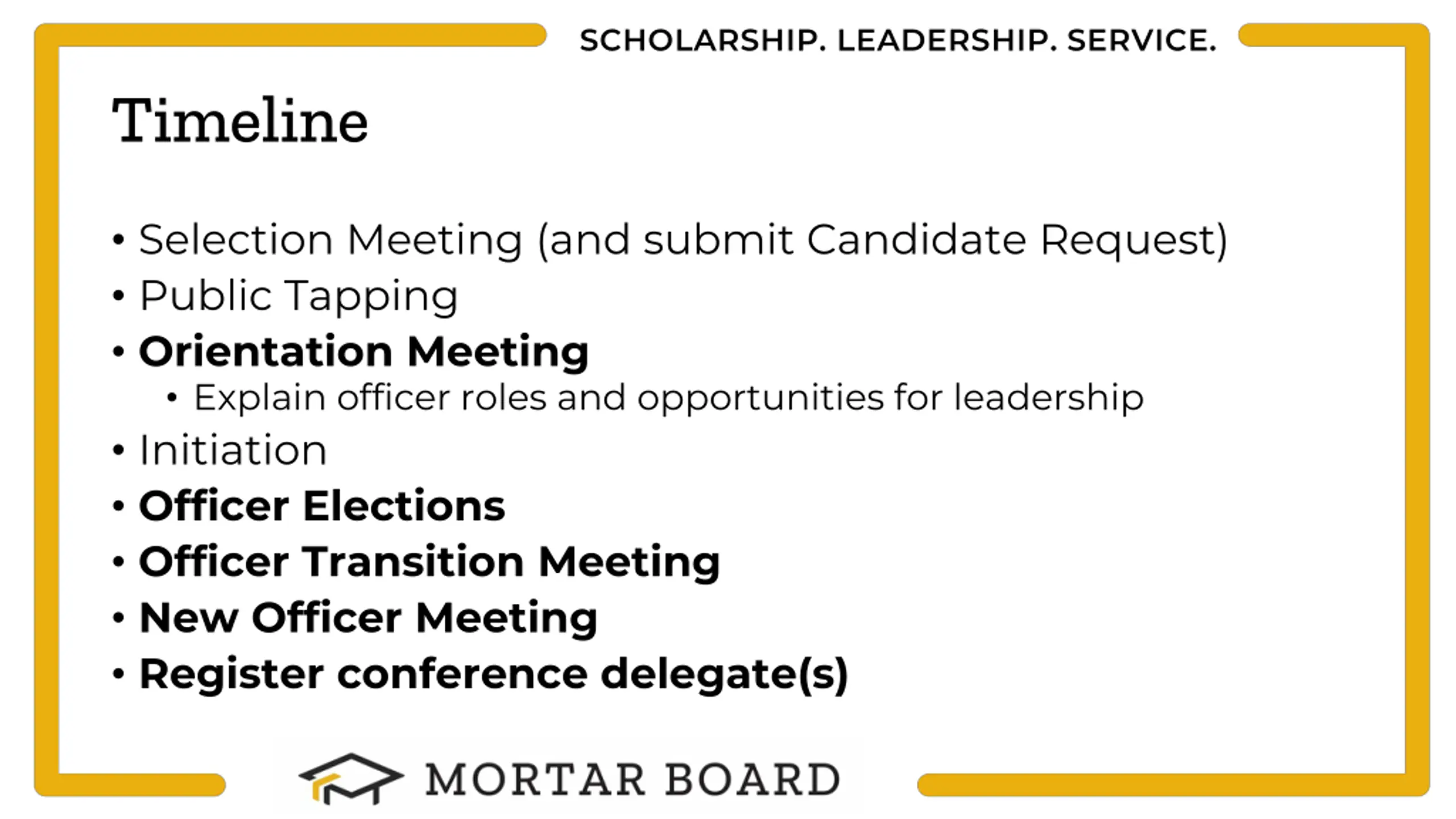 SCHOLARSHIP. LEADERSHIP. SERVICE. Timeline Selection Meeting (and submit Candidate Request) Public Tapping Orientation Meeting Explain officer roles and opportunities for leadership Initiation Officer Elections Officer Transition Meeting New Officer Meeting Register conference delegate(s)