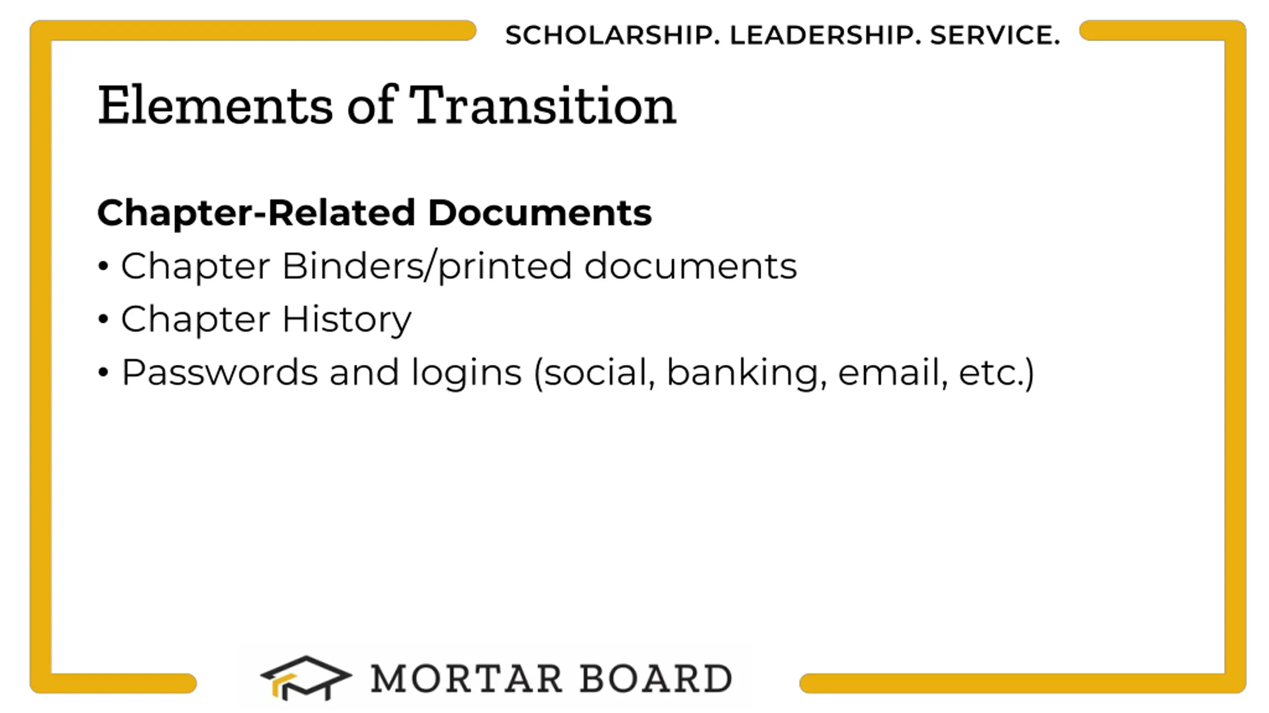 SCHOLARSHIP. LEADERSHIP. SERVICE. Elements of Transition Chapter-Related Documents Chapter Binders/printed documents Chapter History Passwords and logins (social, banking, email, etc.)