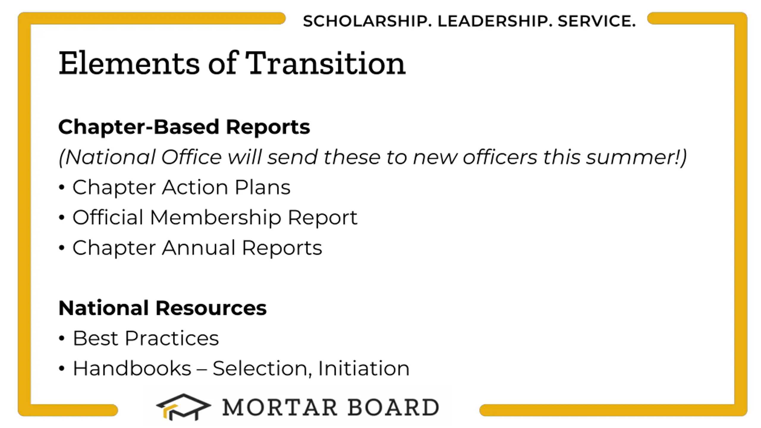 SCHOLARSHIP. LEADERSHIP. SERVICE. Elements of Transition Chapter-Based Reports (National Office will send these to new officers this summer!) Chapter Action Plans Official Membership Report Chapter Annual Reports National Resources Best Practices Handbooks Selection, Initiation