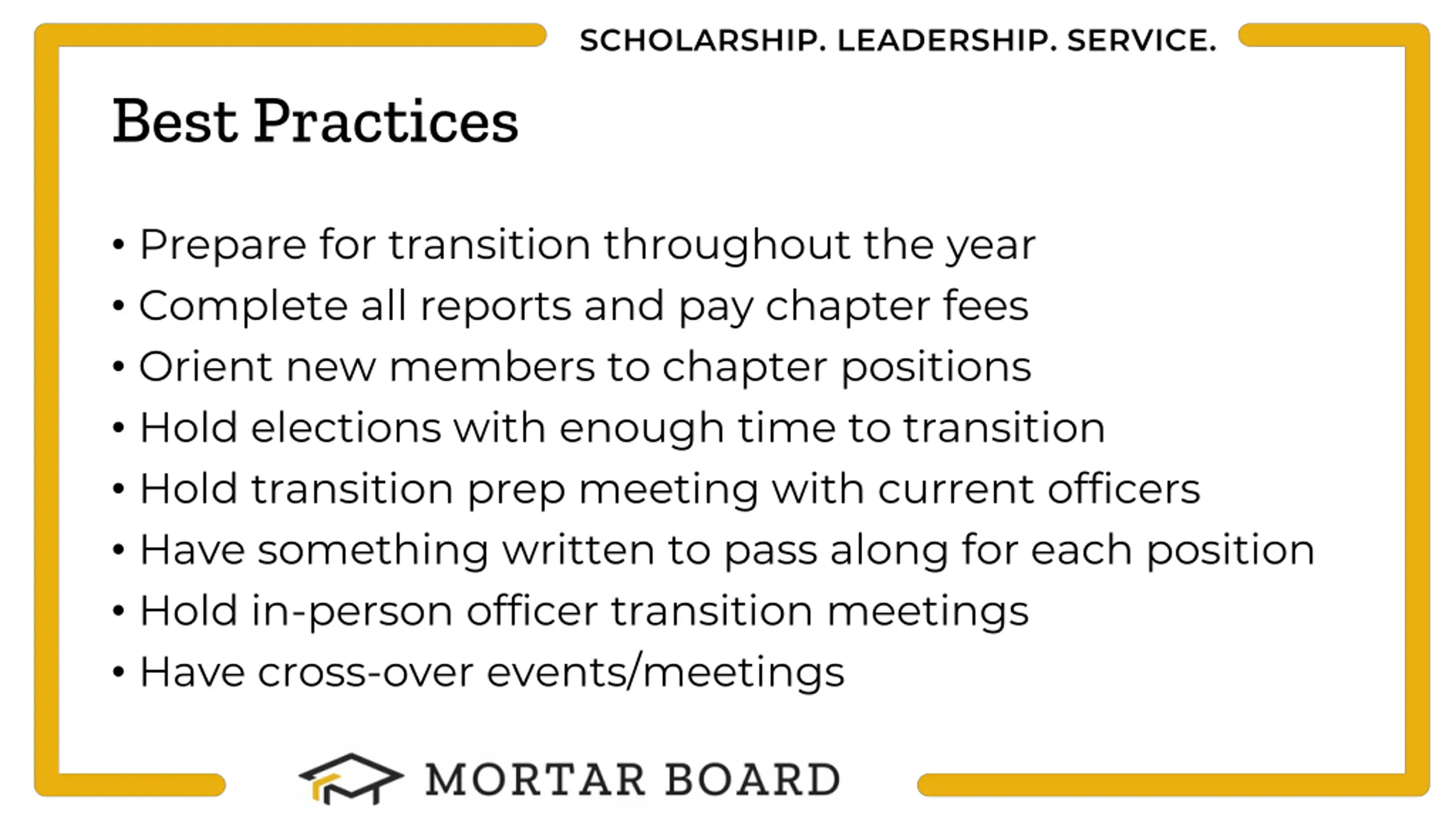 SCHOLARSHIP. LEADERSHIP. SERVICE. Best Practices Prepare for transition throughout the year Complete all reports and pay chapter fees Orient new members to chapter positions Hold elections with enough time to transition Hold transition prep meeting with current officers Have something written to pass along for each position Hold in-person officer transition meetings Have cross-over events/meetings