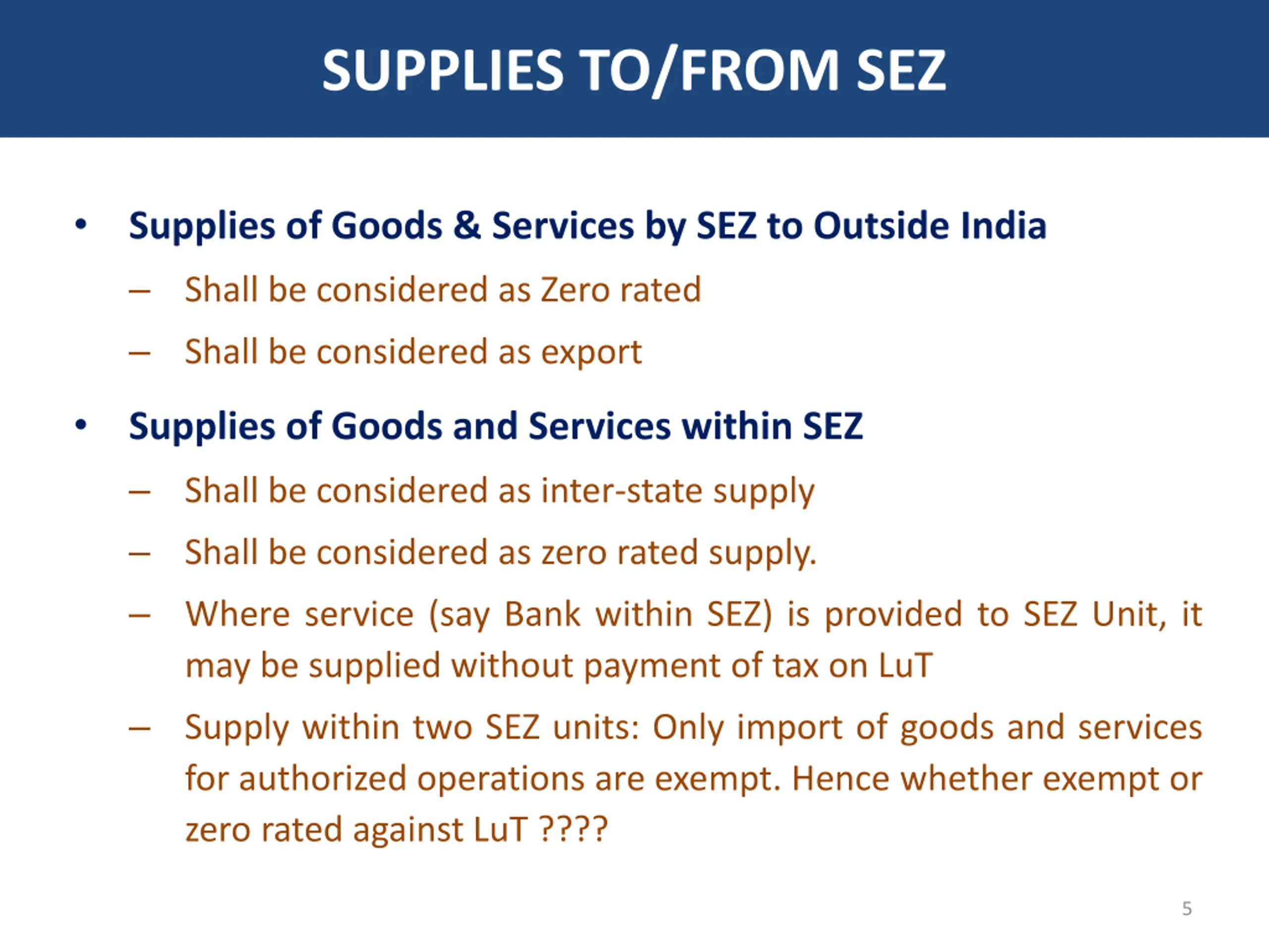 SUPPLIES TO/FROM SEZ Procurement of Services (Import) from Outside India by SEZ Shall be considered as import Import for authorized operations - Exempt vide Notification No. 18/2017-IGST Supplies of Goods and Services by SEZ to DTA Shall be considered as inter-state supply Goods shall be subject to Customs Duty and IGST; Services shall be subject to IGST As per Rule 48/SEZ Rules, bill of entry shall be filed by DTA buyer. SEZ Unit may also file BE, if so authorized by DTA buyer. 4