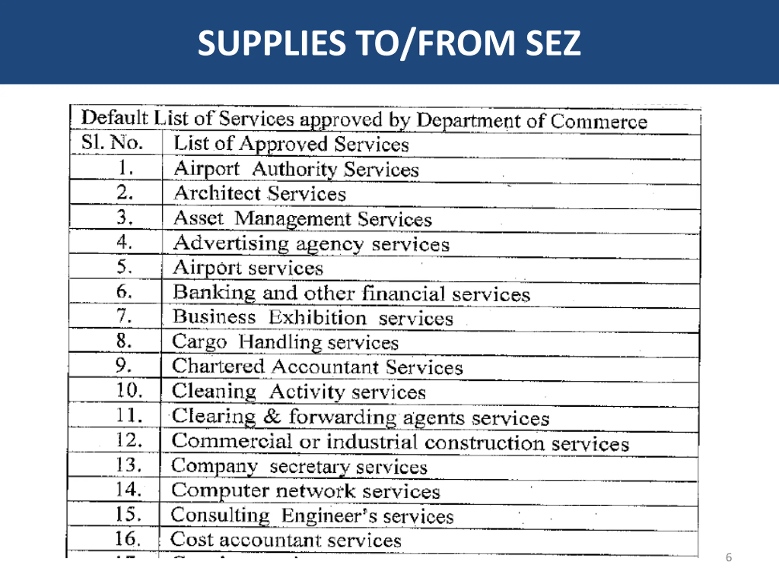 SUPPLIES TO/FROM SEZ Supplies of Goods & Services by SEZ to Outside India Shall be considered as Zero rated Shall be considered as export Supplies of Goods and Services within SEZ Shall be considered as inter-state supply Shall be considered as zero rated supply. Where service (say Bank within SEZ) is provided to SEZ Unit, it may be supplied without payment of tax on LuT Supply within two SEZ units: Only import of goods and services for authorized operations are exempt. Hence whether exempt or zero rated against LuT ???? 5